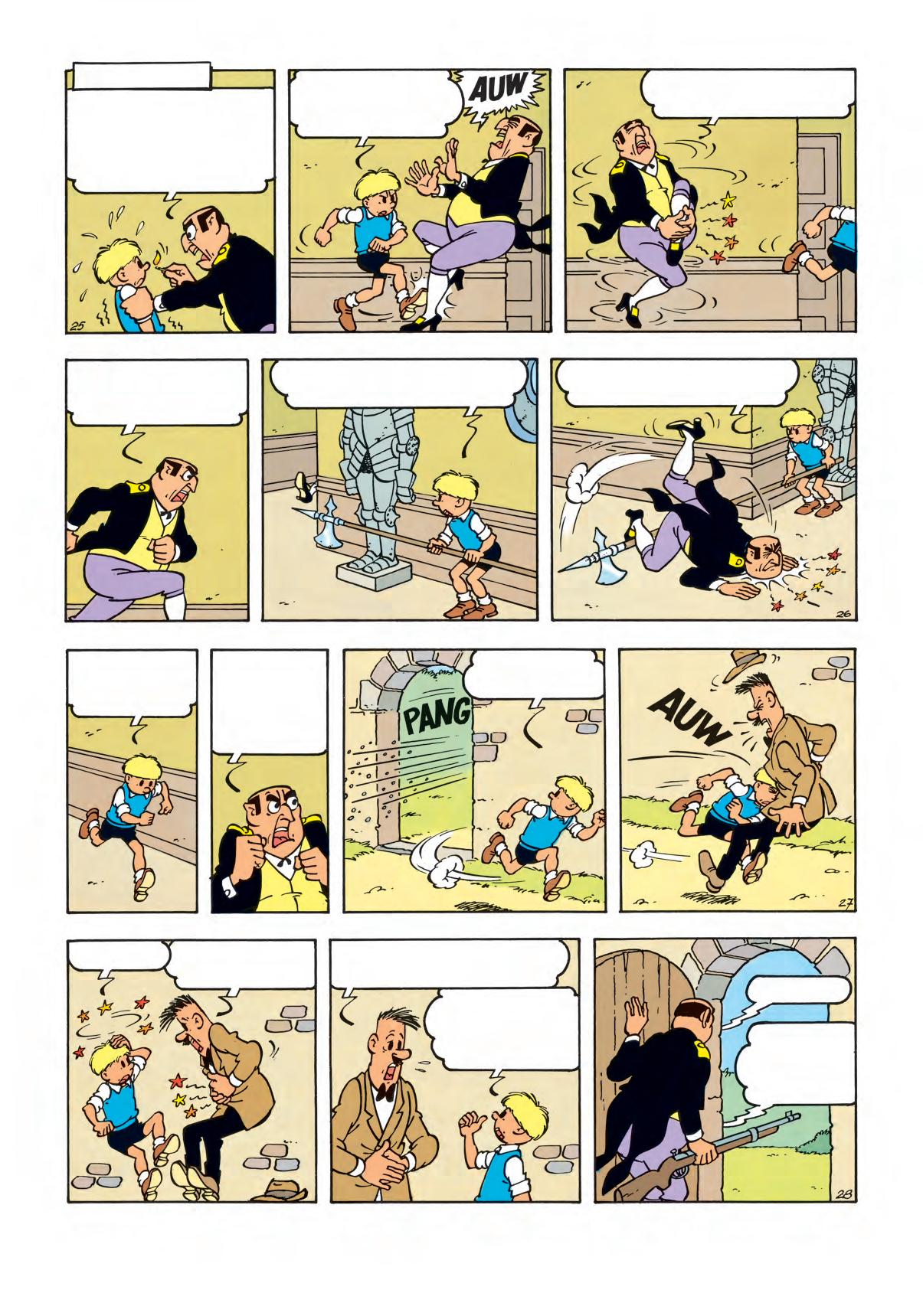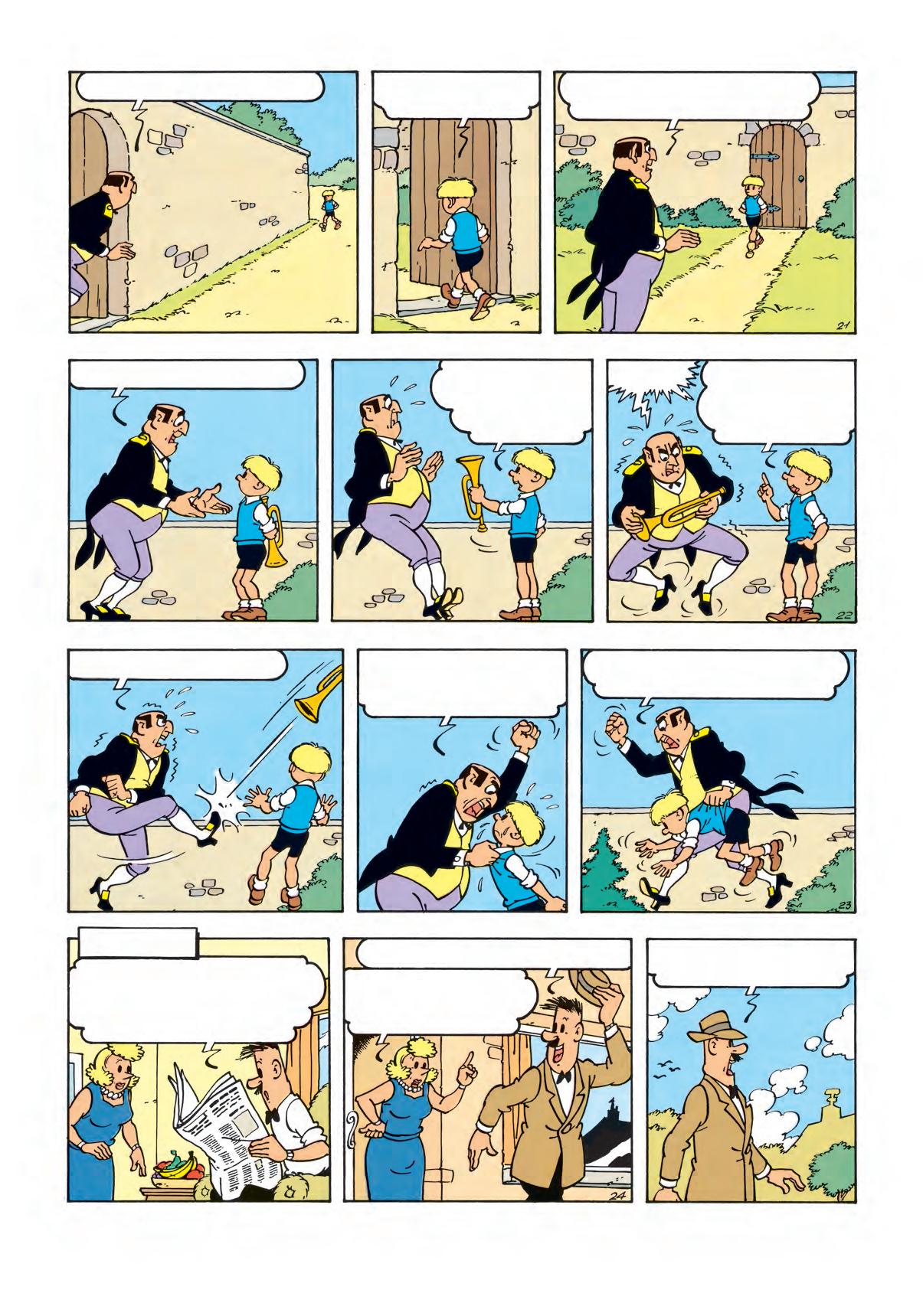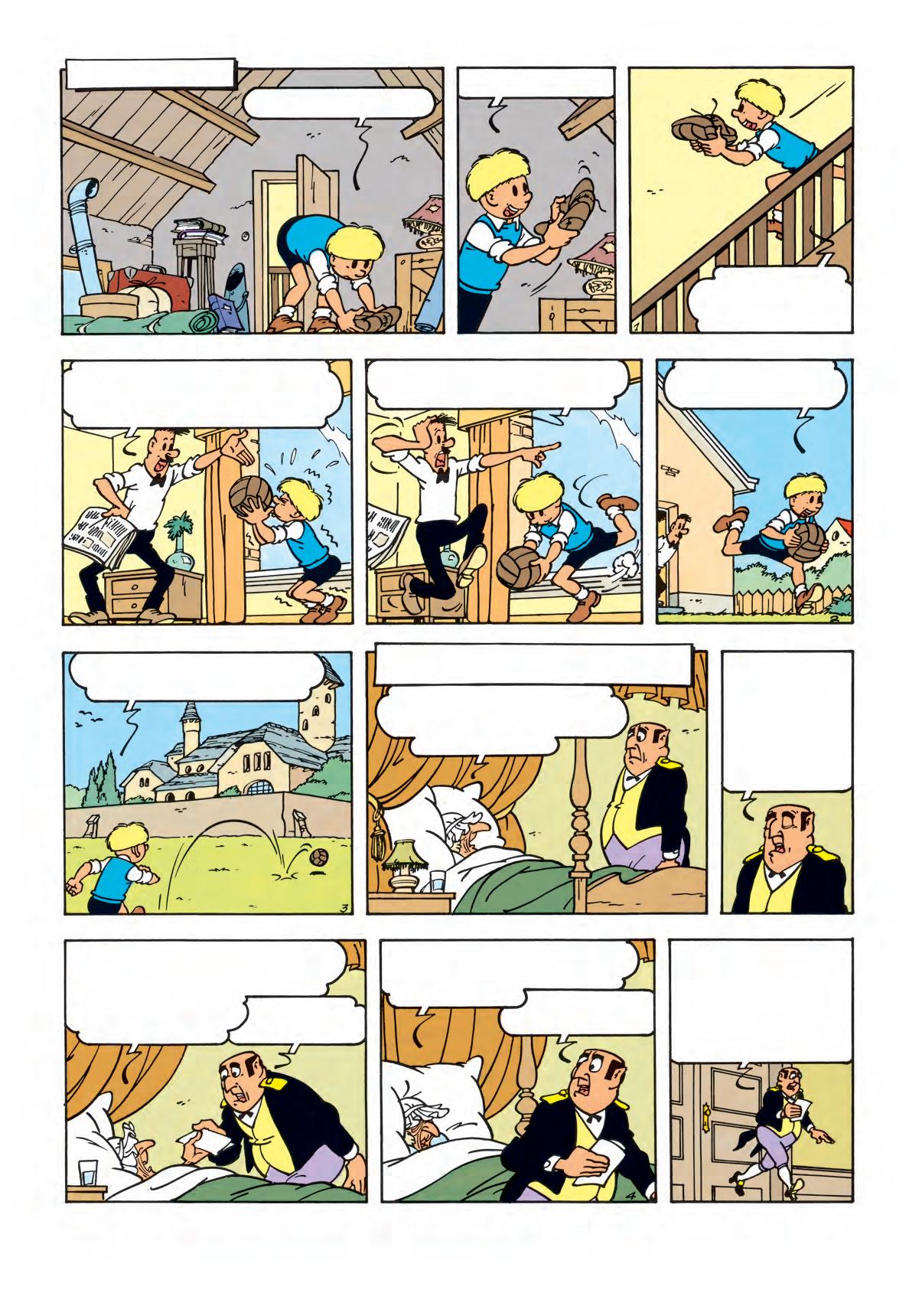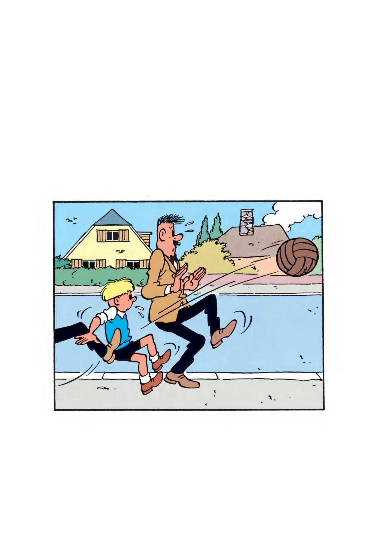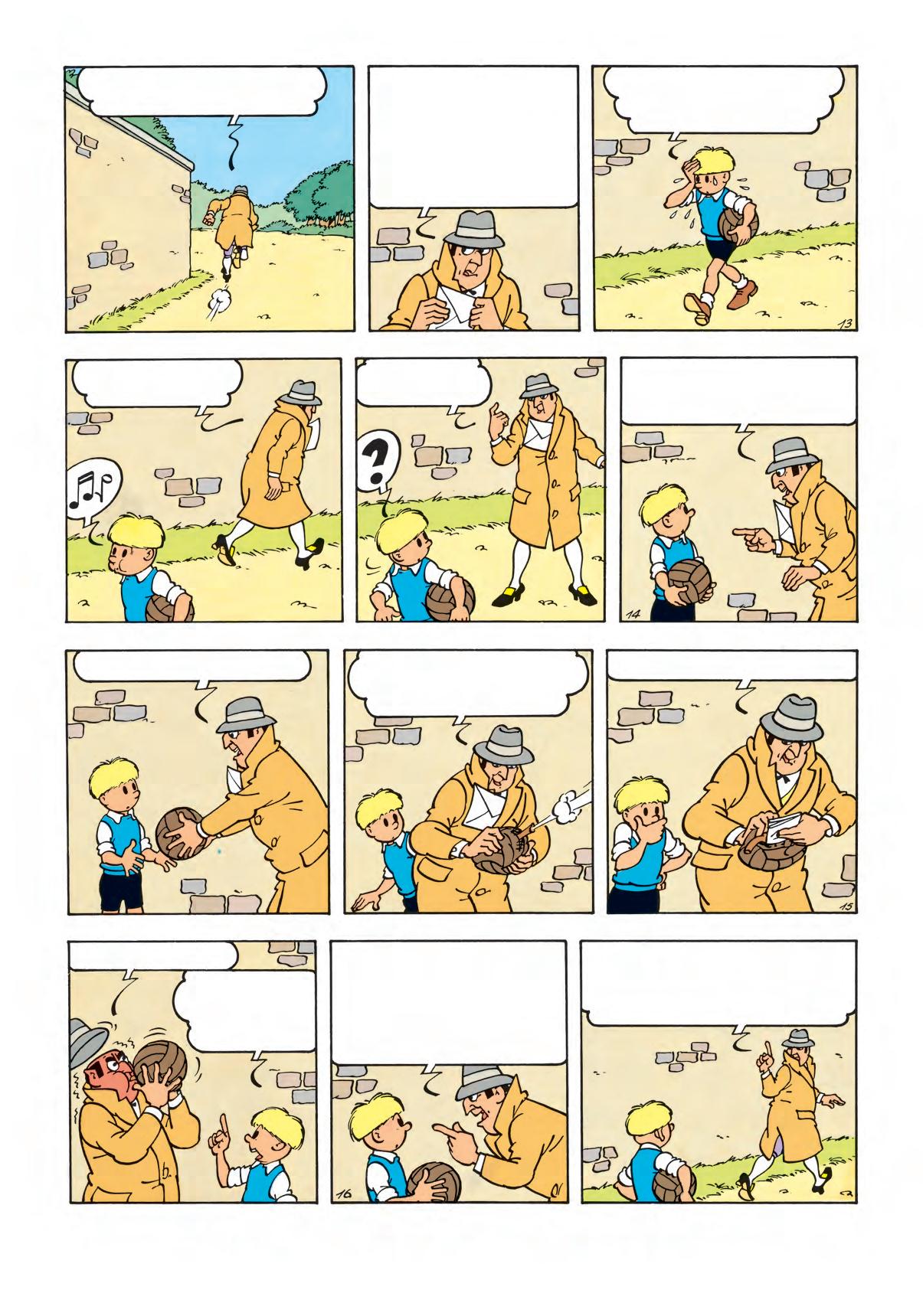 Luister... Bewaar je voetbal goed. Breng <m morgennamiddag, om twee uur, naar <t kasteel. Kom door het achterpoortje. Dan krijg je je geld. Goed begrepen? En vooral aan niemand iets zeggen, want dan heeft je laatste uur geslagen! Tot morgen, twee uur!...