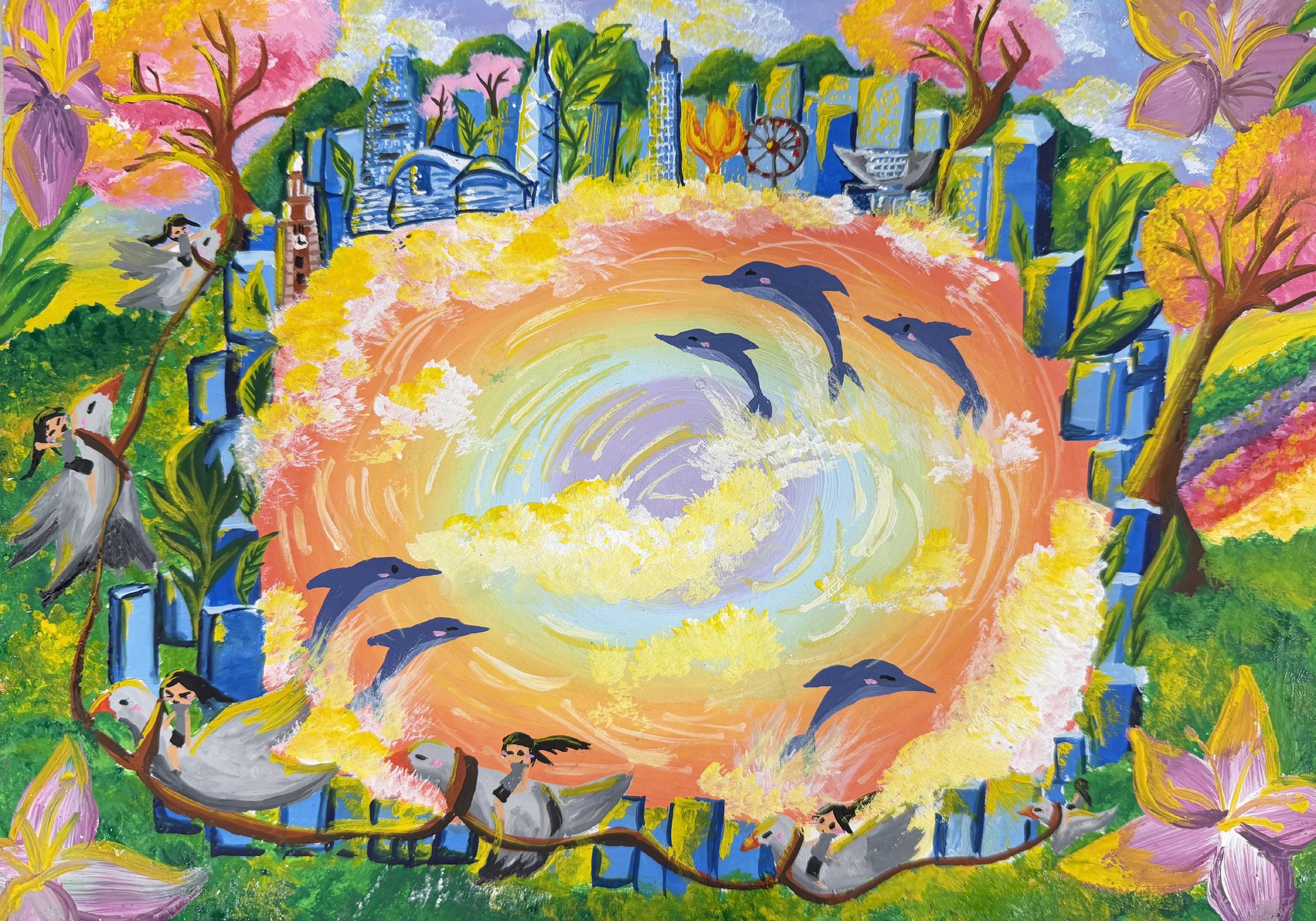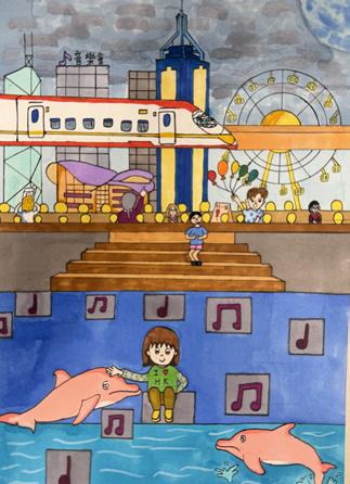 my dream, the future Victoria Harbour becomes a dreamlike and magical sea, full of nature surrounded by flowers and greenery. Cars will turn into little birds, and we can sit on them and fly to wherever we want to go."