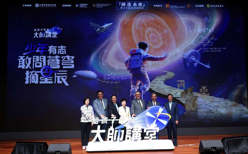中國宋慶齡基金會副主席沈 蓓莉(左四)、香港中聯辦 副主任尹宗華(左三)、香 港民政與青年事務局副局長 梁宏正(左二)、香港賽馬 會副主席兼公益慈善研究院 主席黃嘉純(右三)、香港 青年協會總幹事徐小曼(左 一)、香港宋慶齡基金創會 會長胡曉明(右一)主禮 「締造未來」青少年創新發 展項目的「給孩子們的大師 講堂」走進香港活動。