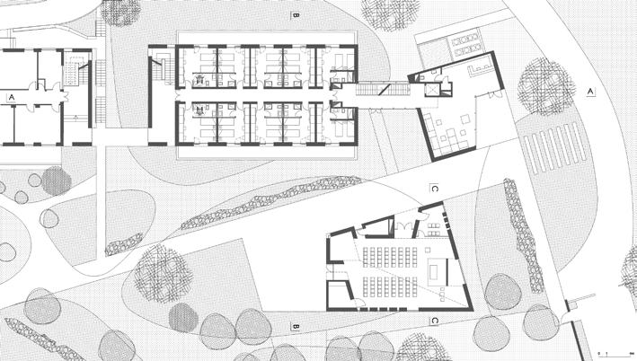 Come elementi semplici e flessibili di ricucitura, ritroviamo i mattoni pieni sui percorsi esterni, nei nuovi brise soleil e sul deck in copertura, questi usati per il parallelepipedo della canna fumaria non nascosta, ma elemento compositivo, segnale e seduta panoramica, a sostegno del pergolato in legno.