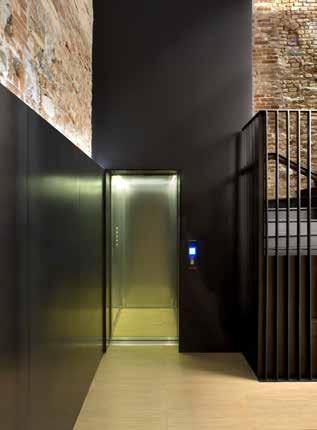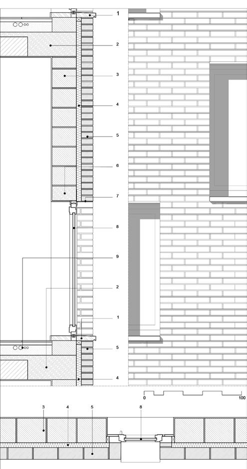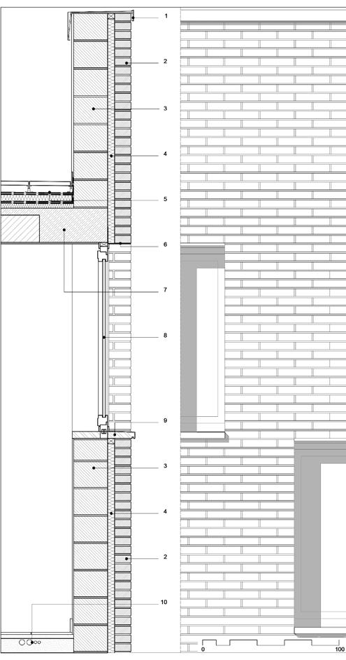 I mattoni pieni allungati, usati in facciata per il “basamento” al primo piano, risolvono efficacemente la necessità di trovare un rivestimento alternativo alla pietra grigia preesistente, che contribuisca attivamente alla nuova stratigrafia della parete.