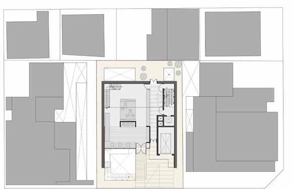 Nell’attacco a terra il rivestimento presenta una immagine massiva rimarcata dall’arretramento della porta di ingresso ad angolo rispetto al filo facciata.