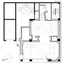 Al primo piano, il rivestimento presenta un taglio orizzontale che si sviluppa lungo i tre fronti. Lungo i fronti nord e ovest il taglio permette la piena trasparenza della chiusura grazie a un’ampia finestratura, mentre lungo il fronte nord esse mette in vista un tamponamento cieco rivestito con elementi vetrati che determinano la continuità formale con la finestratura.