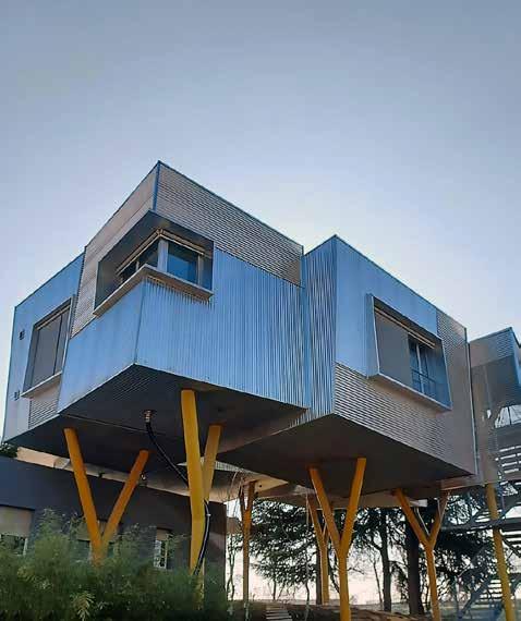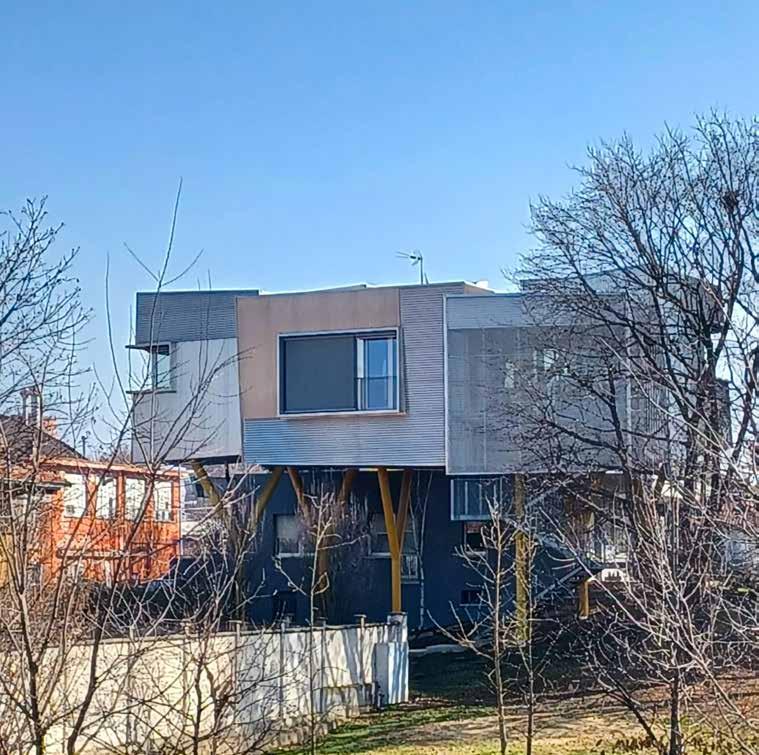 The Hole with the House Around, letteralmente «un buco con una casa intorno» è un edificio concepito da ElasticoFarm (progetto architettonico) e nasce dalla rielaborazione di un edificio residenziale degli anni Settanta, all’interno di un ampio giardino privato a Cambiano, in provincia di Torino. L’edificio è stato totalmente rivestito di lamiera in alluminio ondulata Unimetal. Nei rivestimenti in lamiera grecata a profilo simmetrico Genus 2000, prodotta dall’azienda di Torre San Giorgio (Cuneo), i volumi sospesi di The Hole with the House Around assumono un caratteristico aspetto industriale. Il rivestimento è impiegato in colore argento e disposto parte in verticale e parte in orizzontale. Le facciate ventilate ottenute con la lastra Genus 2000 sono di facile applicazione: sono realizzate in profilatura, disponibili nelle diverse finiture preverniciate e nei principali metalli quali alluminio, acciaio inox o preverniciato e zinco titanio. Con un eccellente rapporto qualità-prezzo, il sistema si completa di tutti gli accessori principali per realizzare angoli e finiture laterali. Le sottostrutture disponibili permettono il distanziamento della facciata secondo le esigenze costruttive.