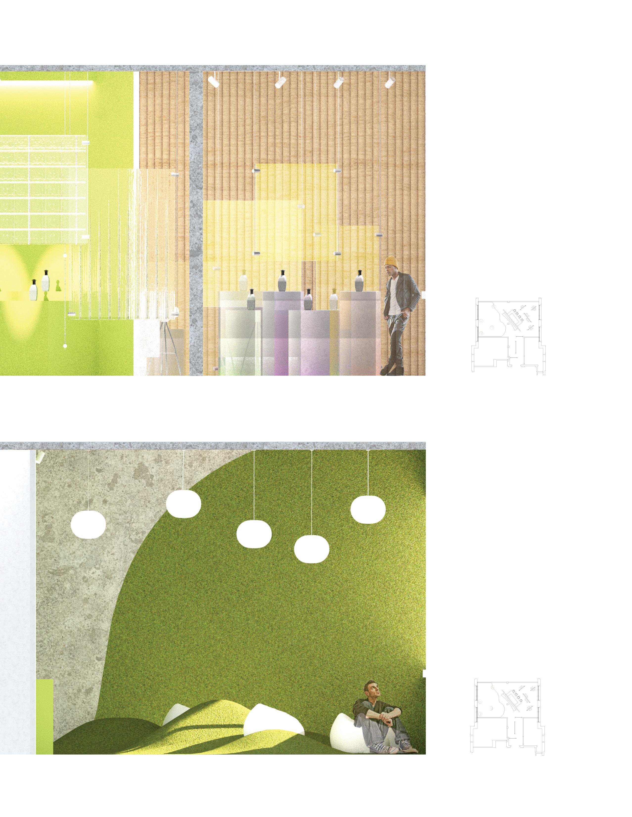 Material experiments informed the final palette of dichroic glass, reeded panels, concrete, and artificial turf. Physical light studies tested chromatic dispersion and reflection behavior, shaping how color interacts with both product and visitor.