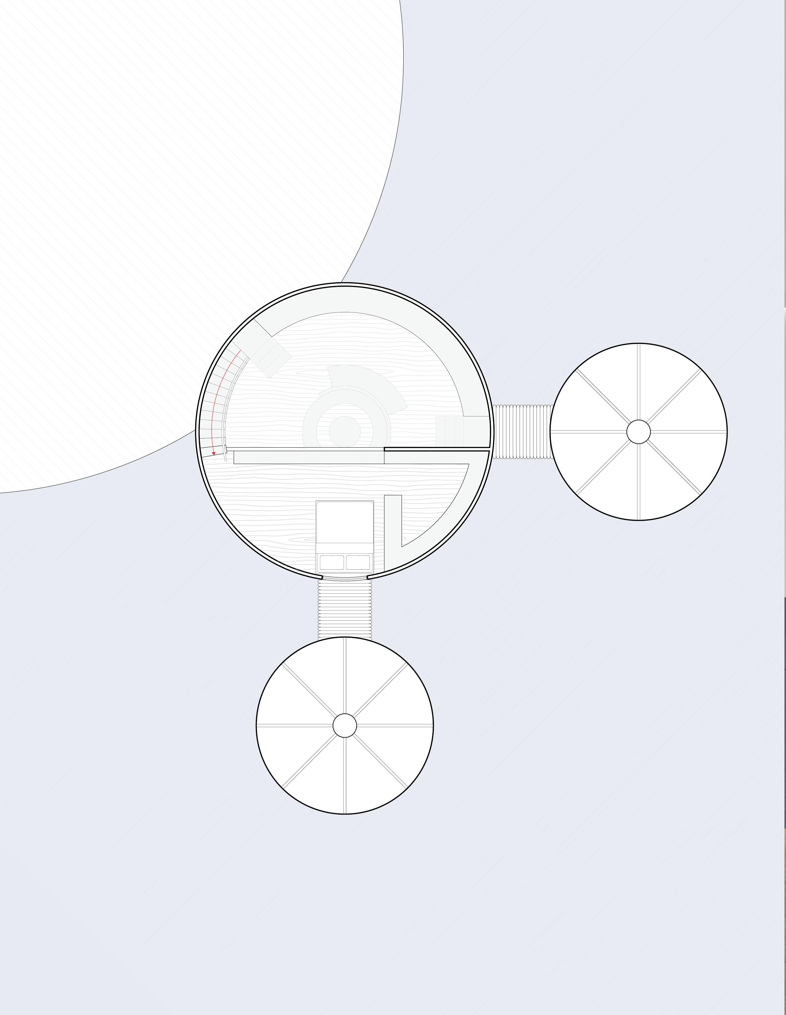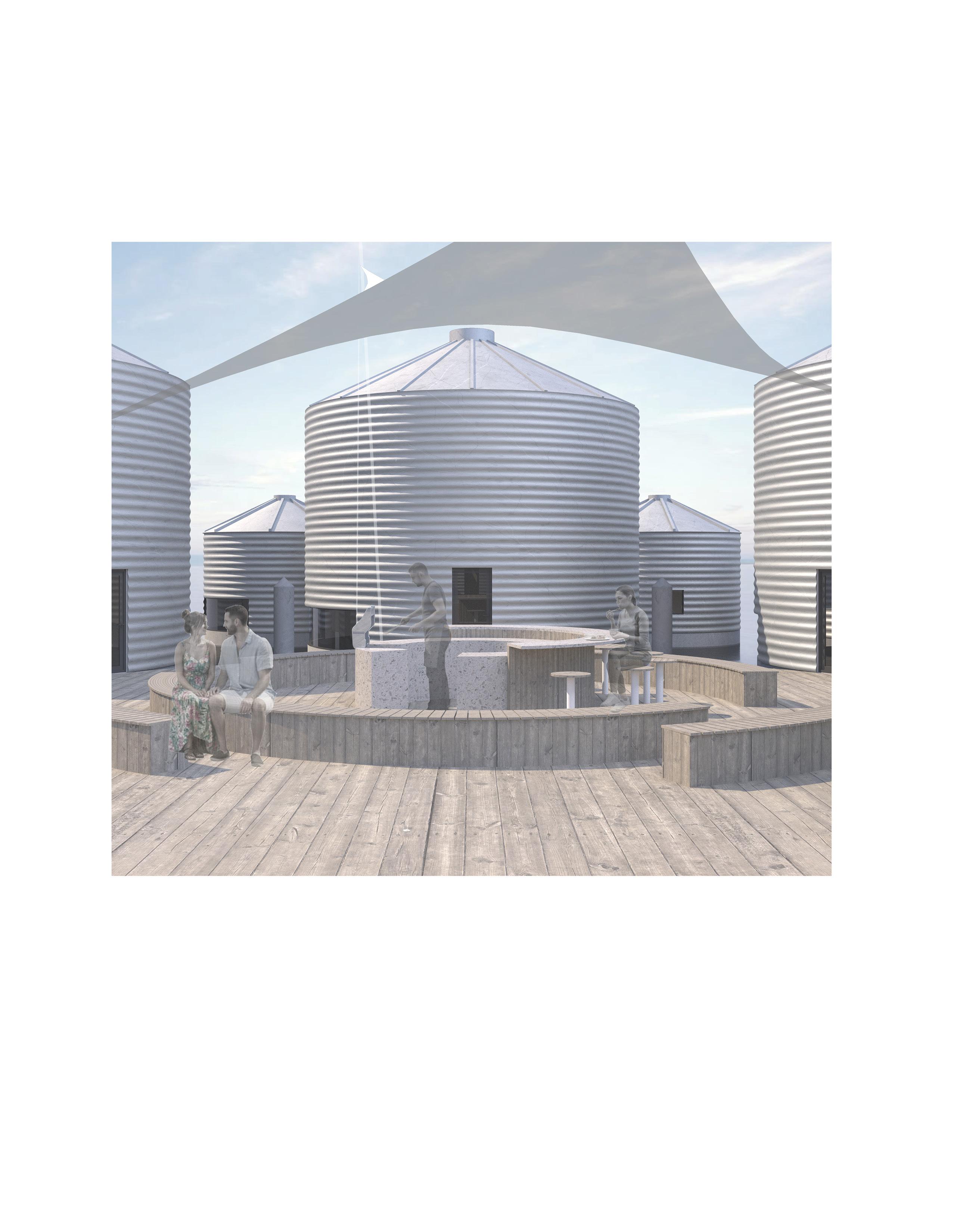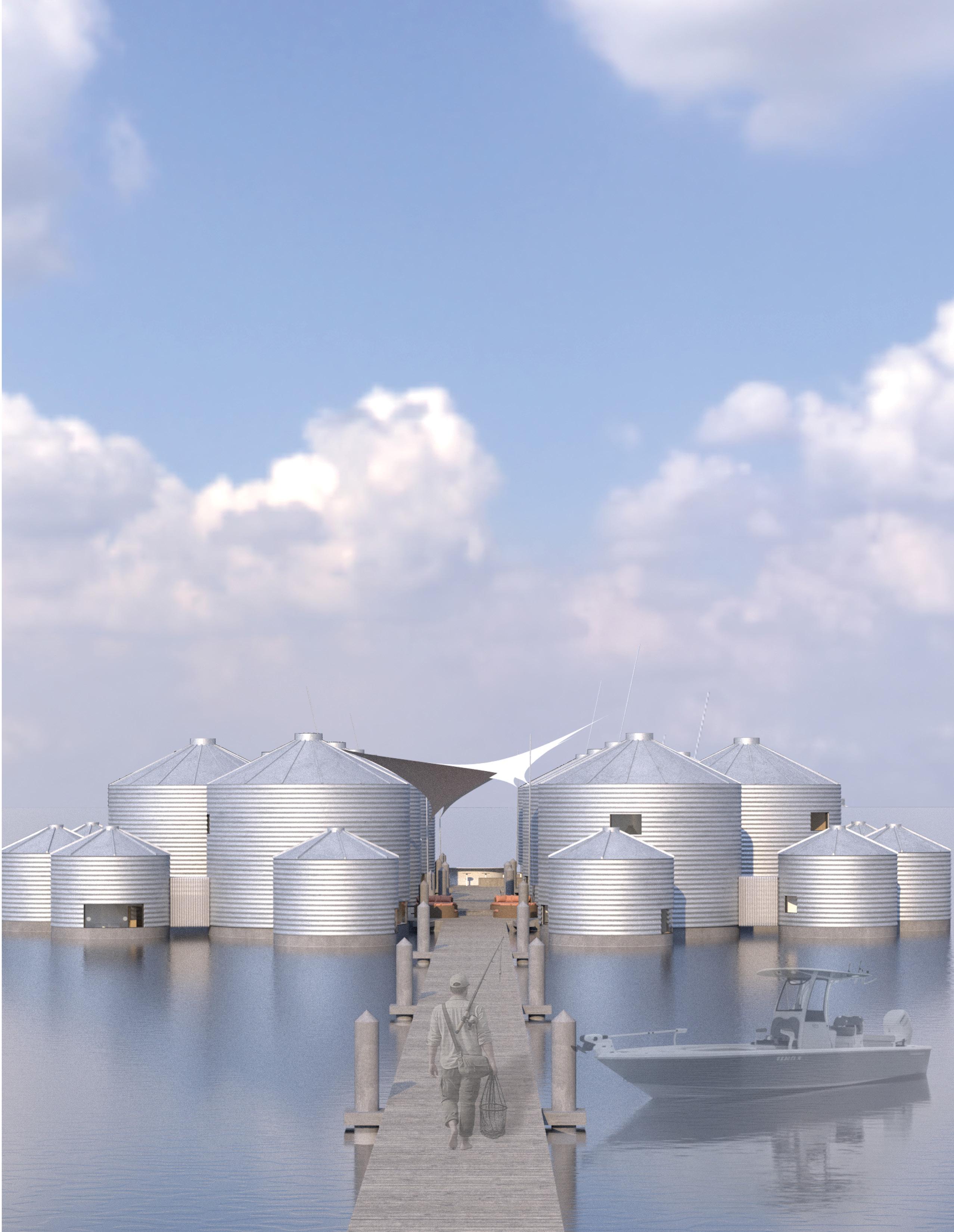 Buoyant, Interdependent proposes a floating habitat where community is shaped through shared reliance rather than fixed ground. Repurposed grain silos are transformed into modular dwellings linked by collective infrastructure, supporting diverse modes of living while reinforcing social connection. Circulation paths, communal platforms, and shared resources create a spatial framework that encourages encounter, cooperation, and mutual support.