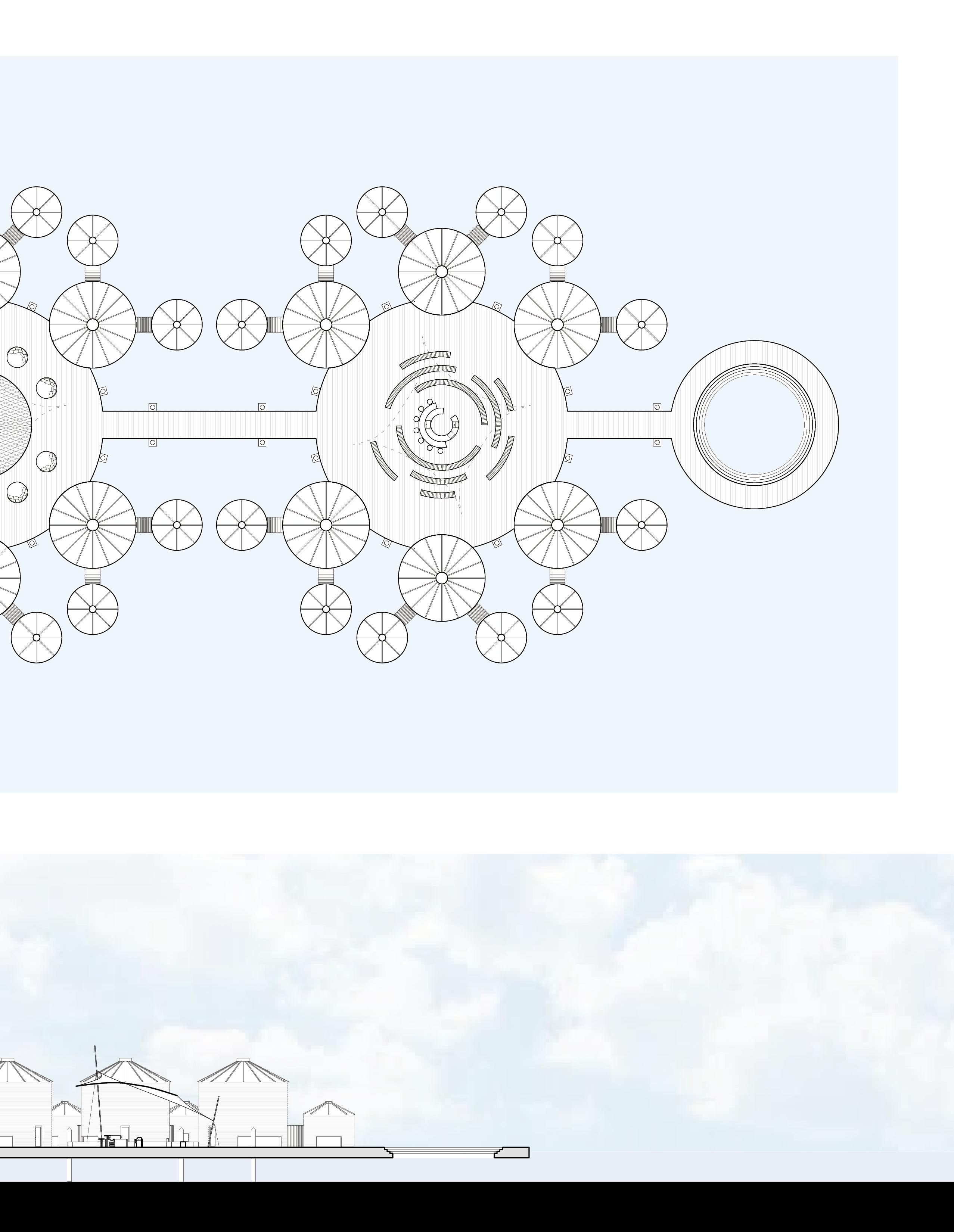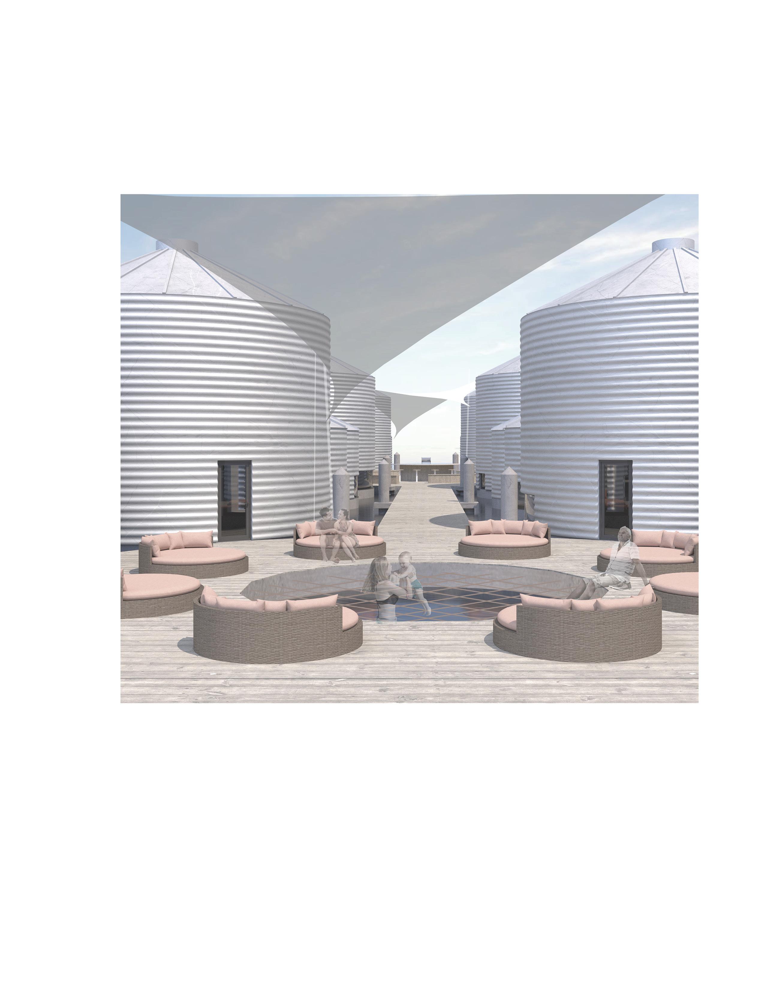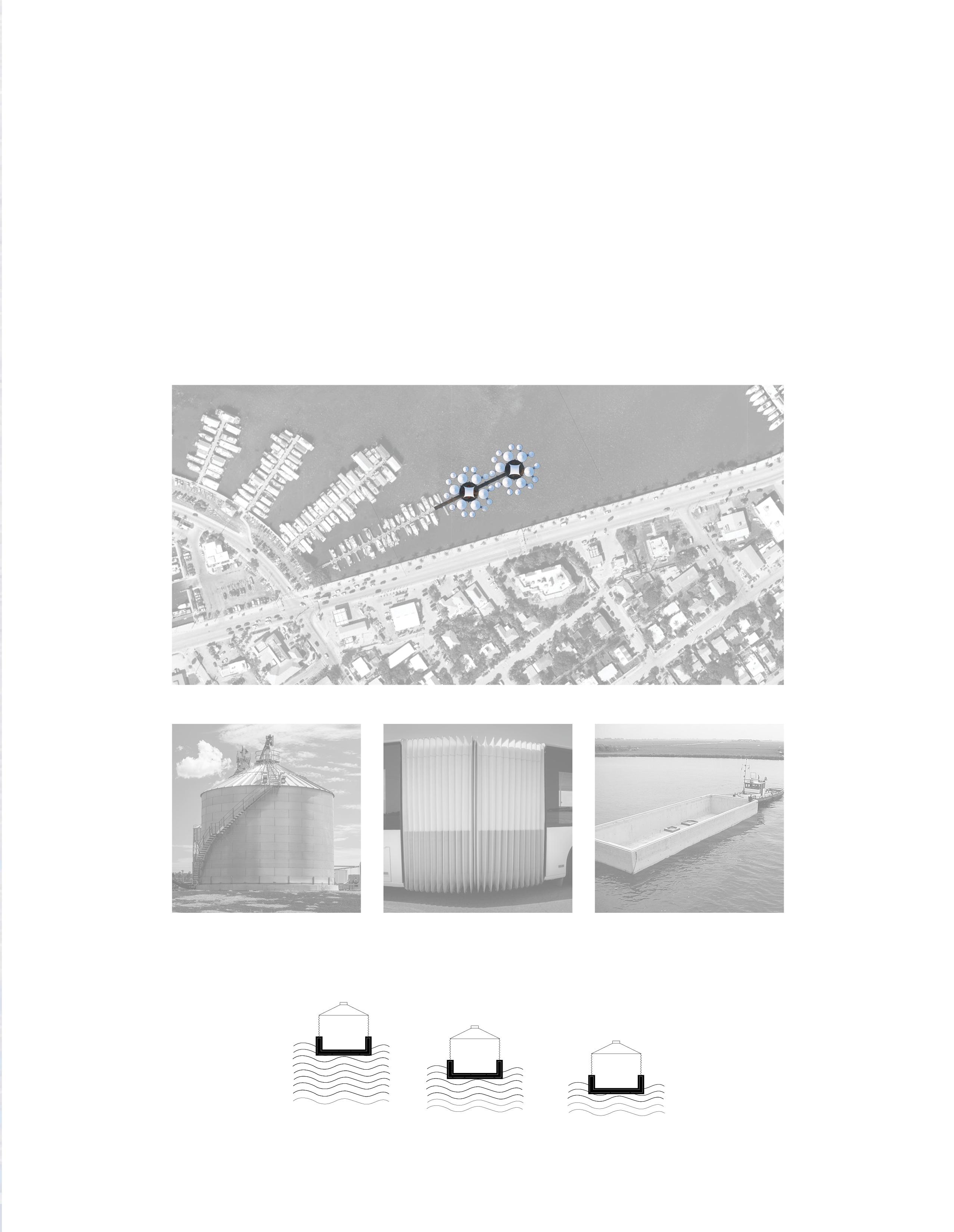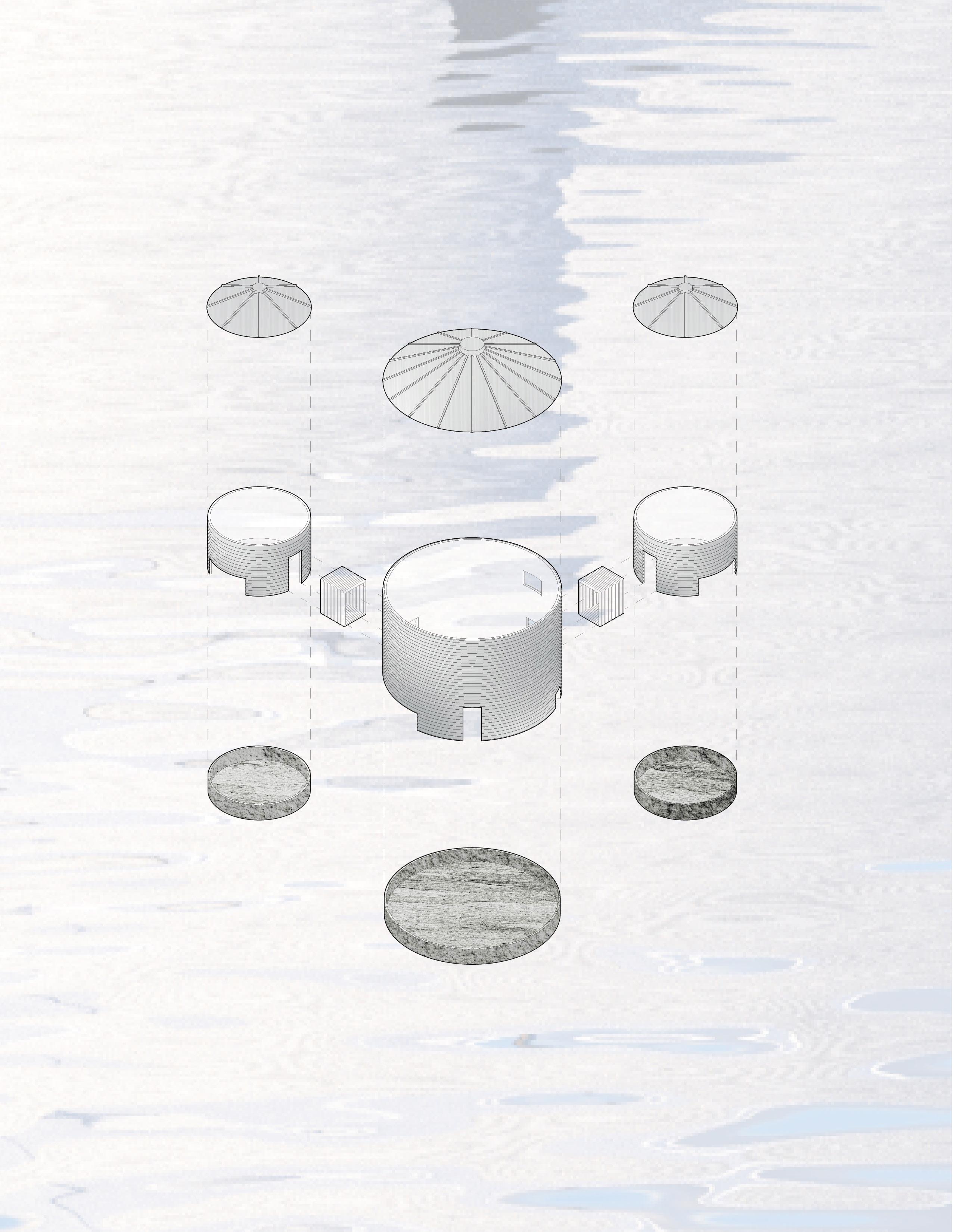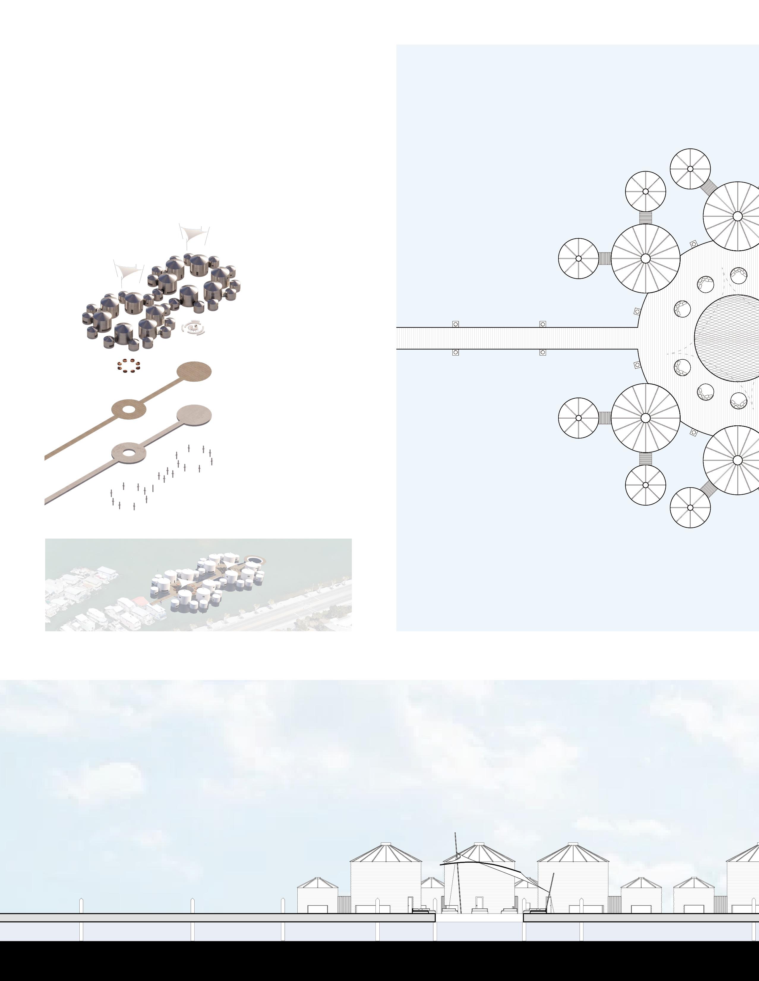 Salvaged grain silos and concrete tubs are retrofitted into buoyant structural units, forming a modular framework for floating community. Linked by shared platforms, the system promotes resource efficiency while enabling collective living.