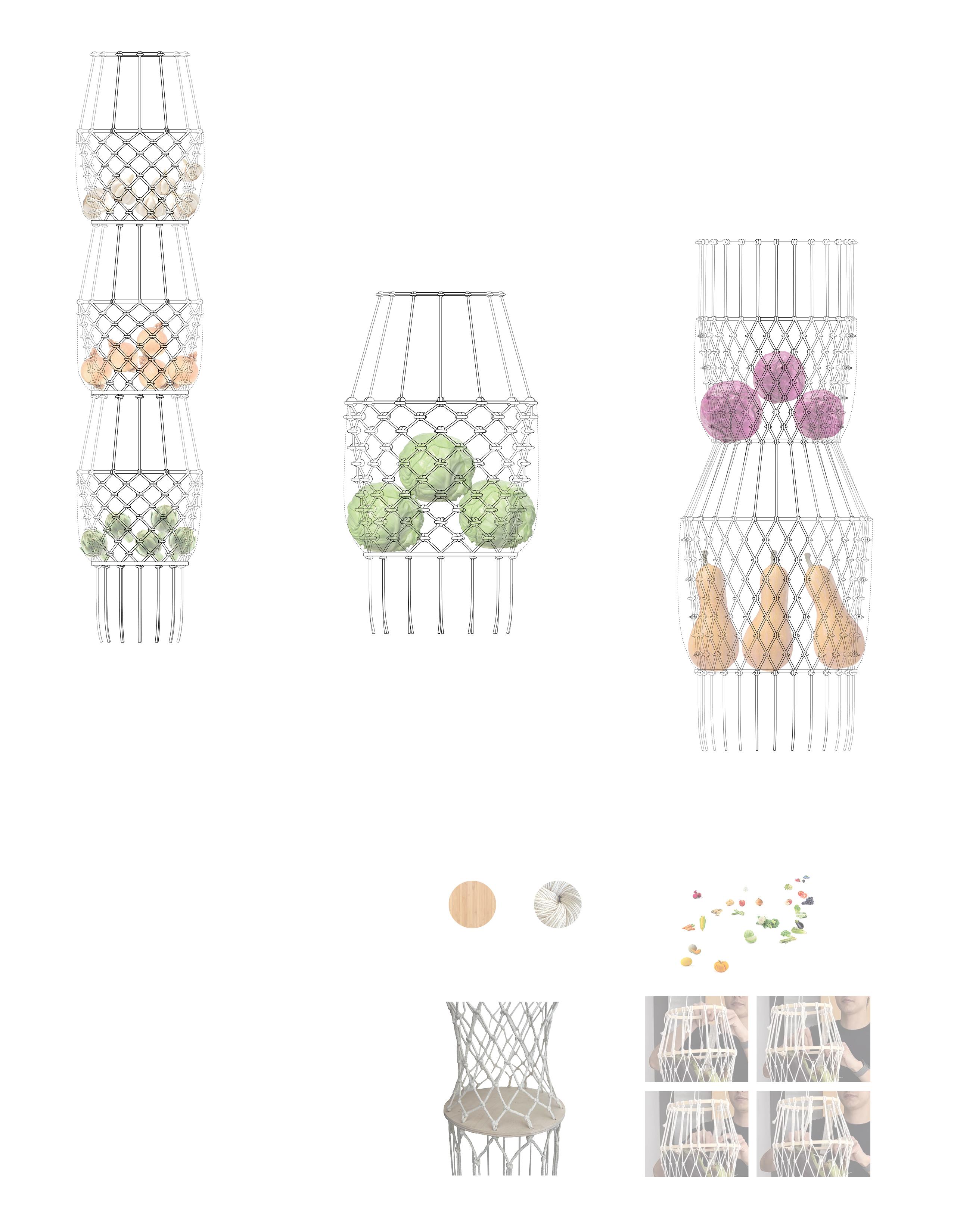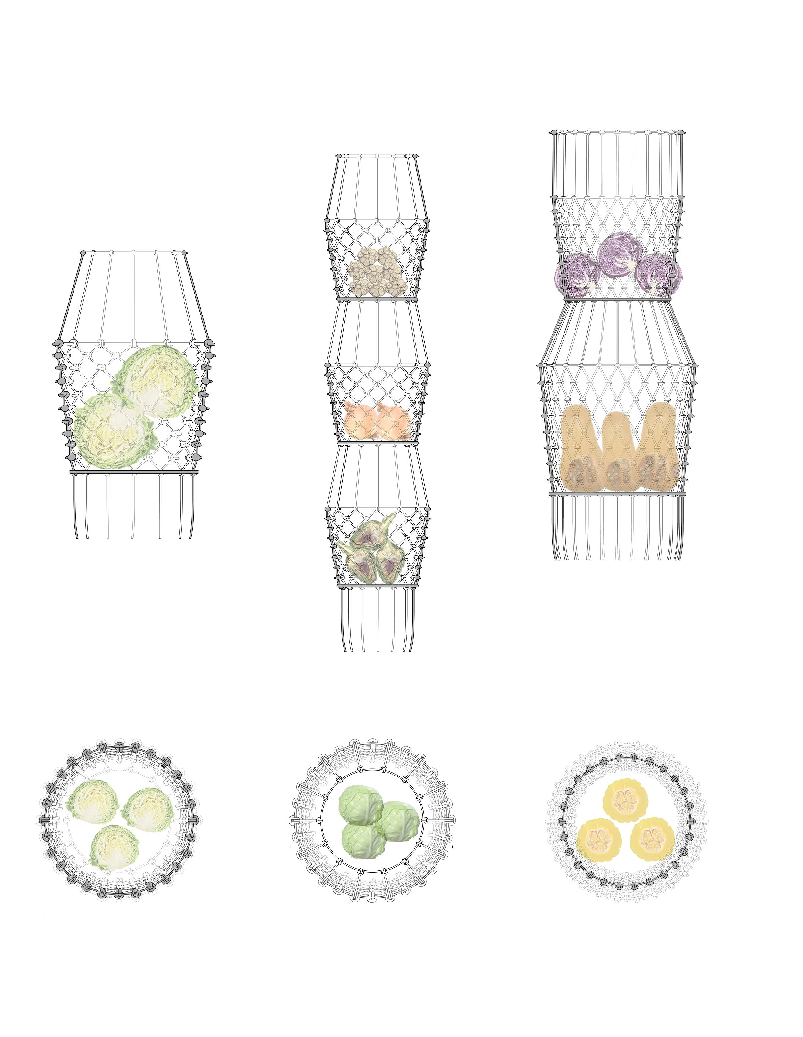 Variations in knot density, material thickness, and proportions allow the system to flexibly store small, delicate produce and larger items alike.