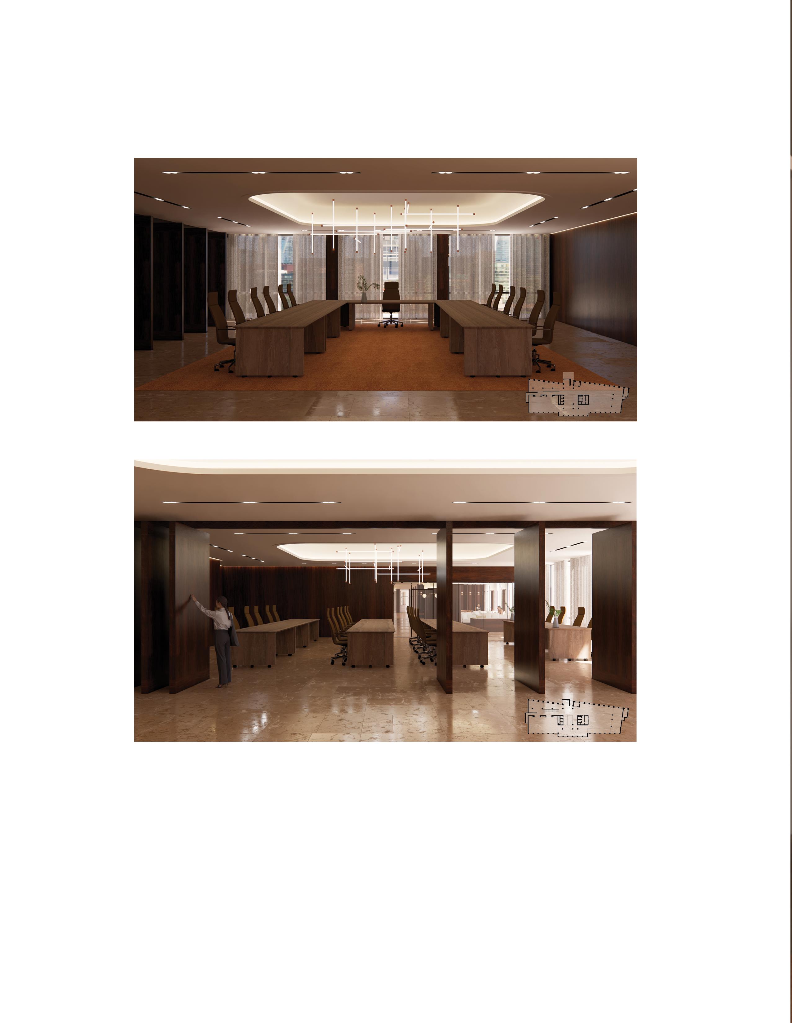 The suite is designed with flexibility in mind: operable partitions allow individual rooms to merge into a larger gathering space, accommodating presentations, receptions, or formal events.