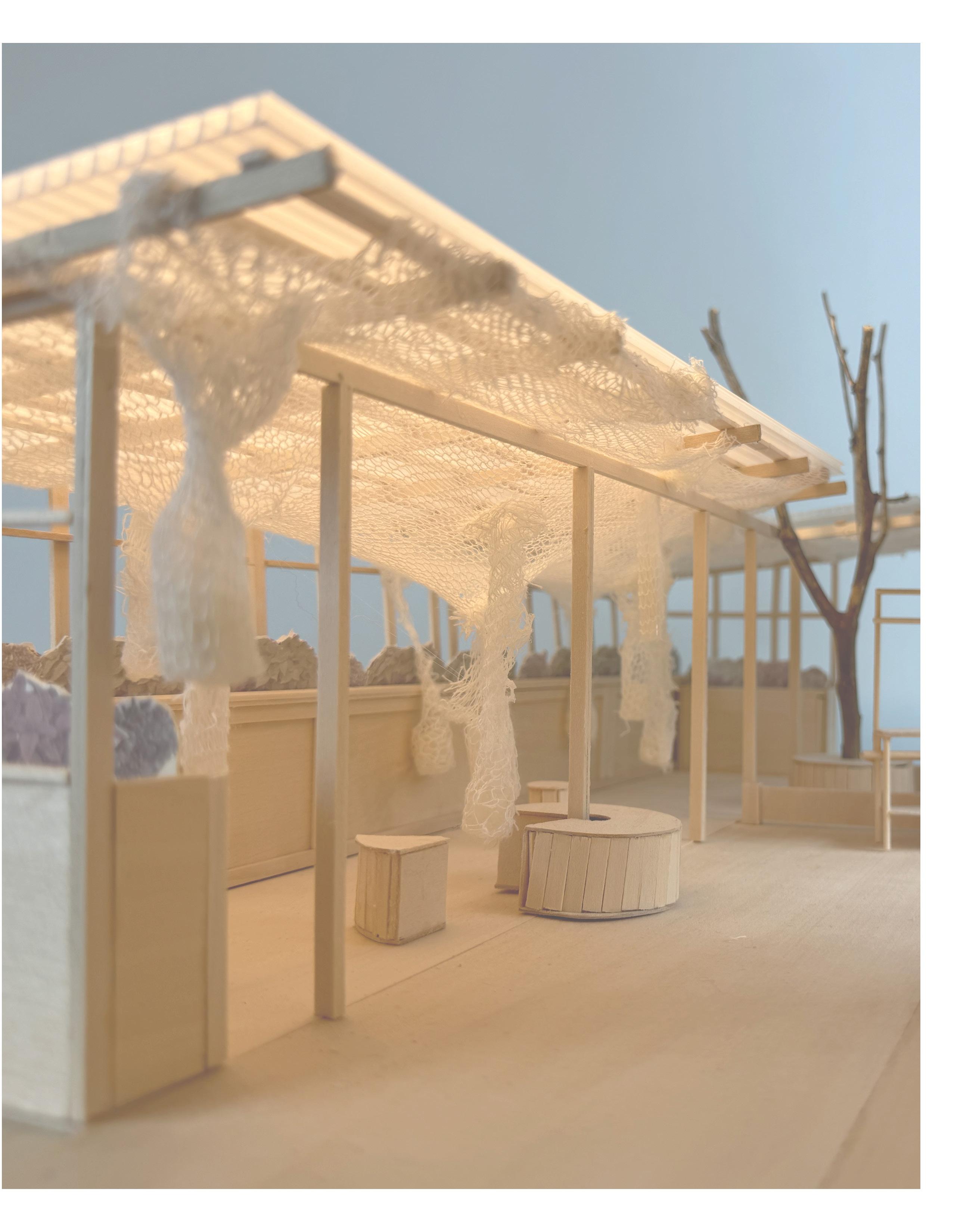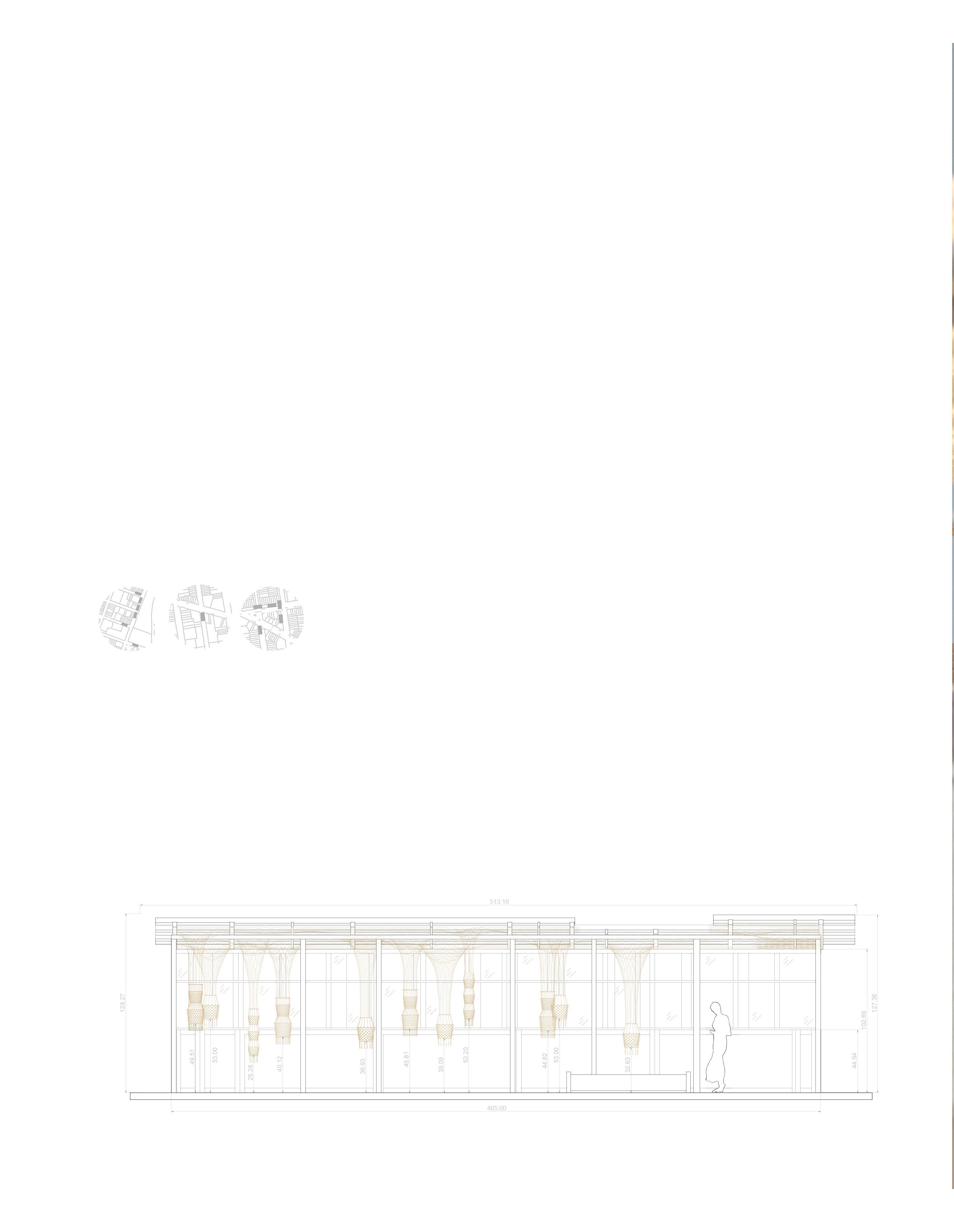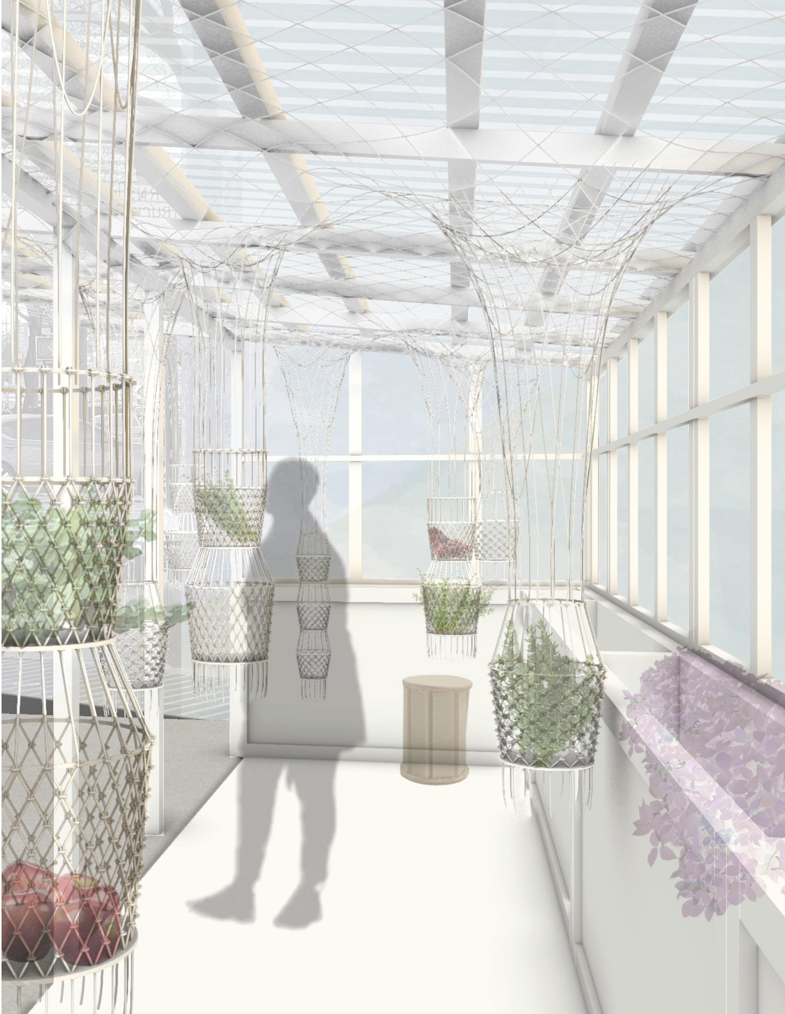 A network of knotted containers is suspended within the existing shed infrastructure, creating a permeable and visually engaging food display. The intervention bridges the gap between growers and urban consumers, fostering community-driven food accessibility through seasonal programs and partnerships with local farms and food organizations. As a system that transforms both spatially and socially, Changing Ties reimagines public space as an evolving platform for food distribution, interaction, and shared sustainability.