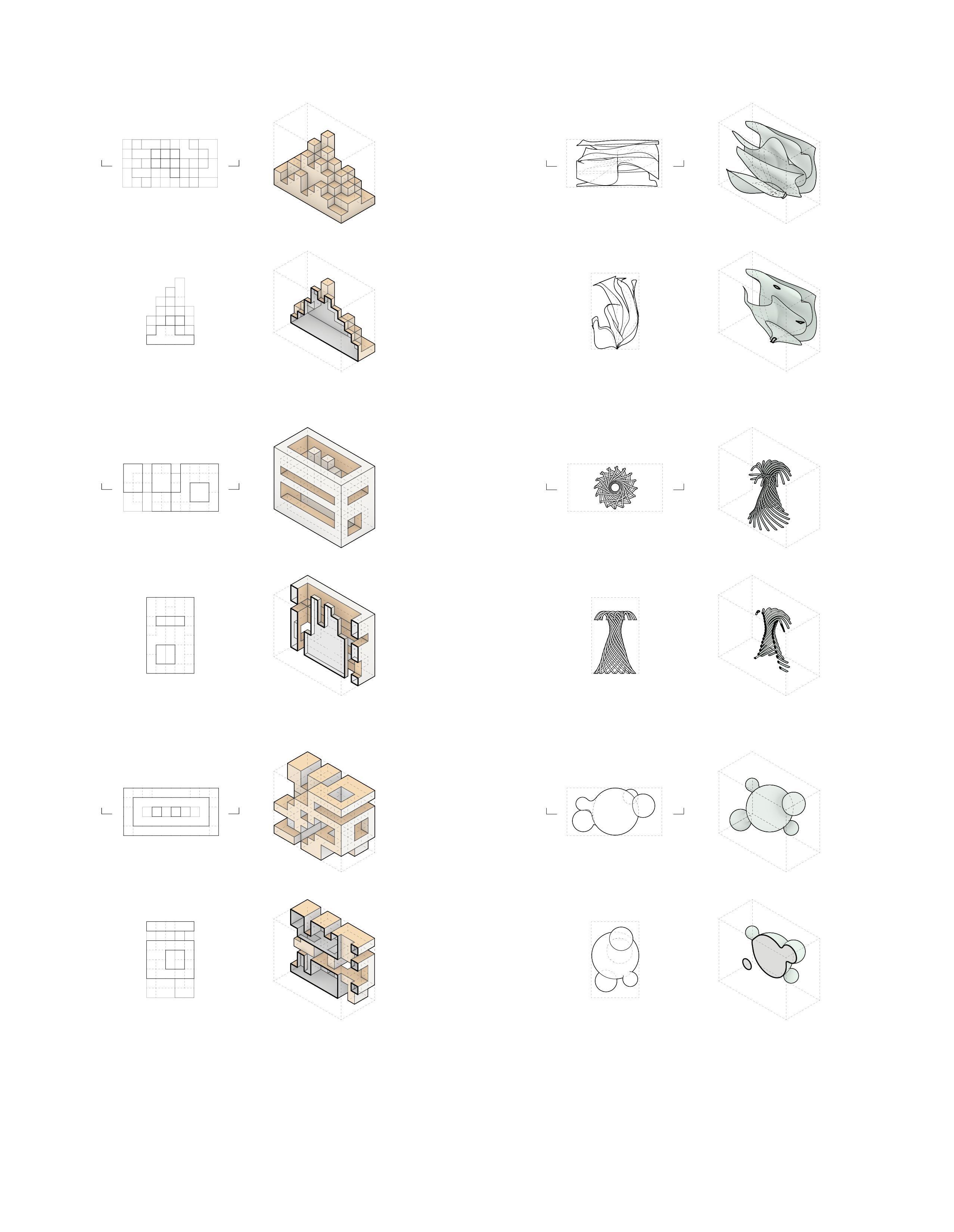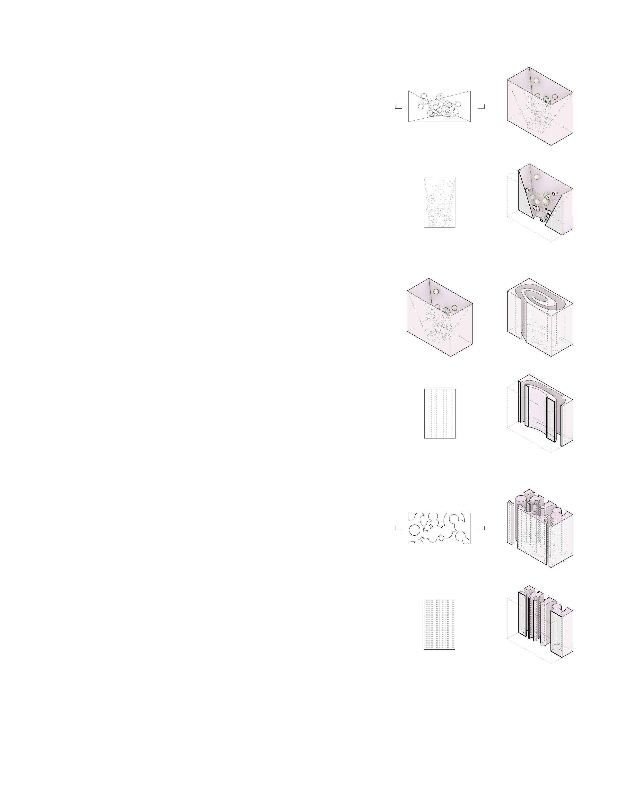 Guided by three operative verbs, this project explores spatial composition through iterative geometric studies. Additive and subtractive strategies shape environments that collect interaction, enclose reflection, and support occupation. Flexible boundaries and layered geometries balance openness with enclosure, fostering both collective engagement and individual retreat.