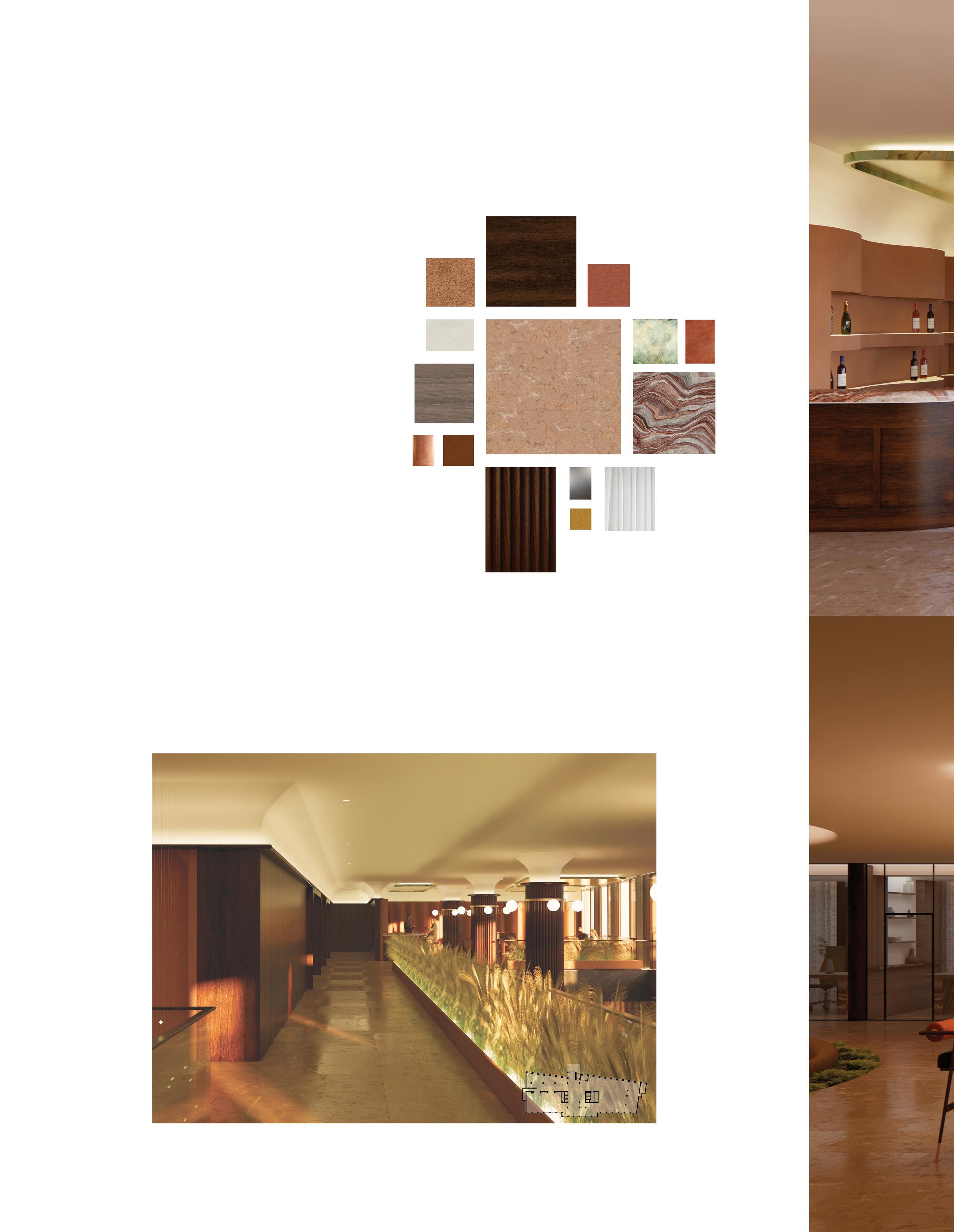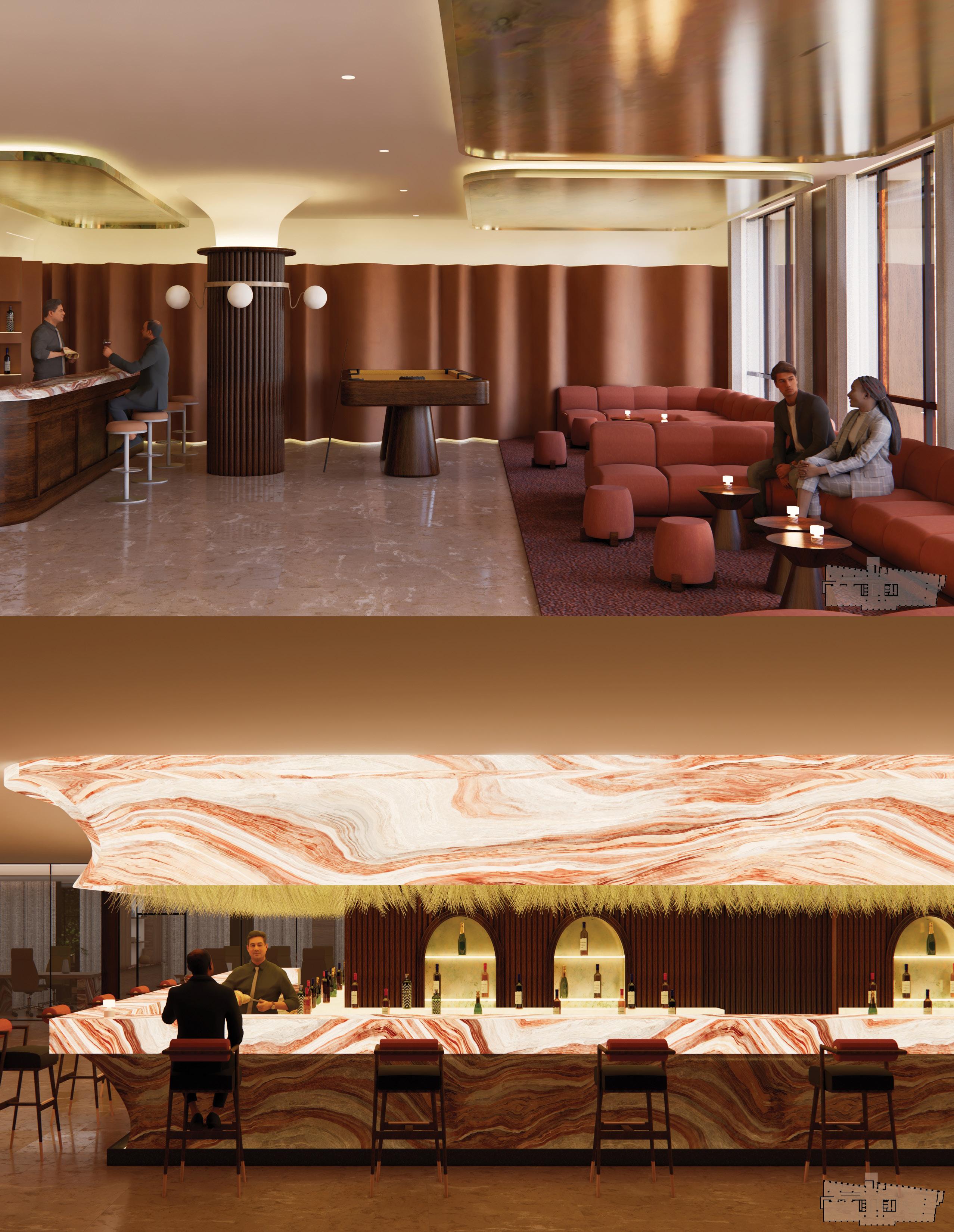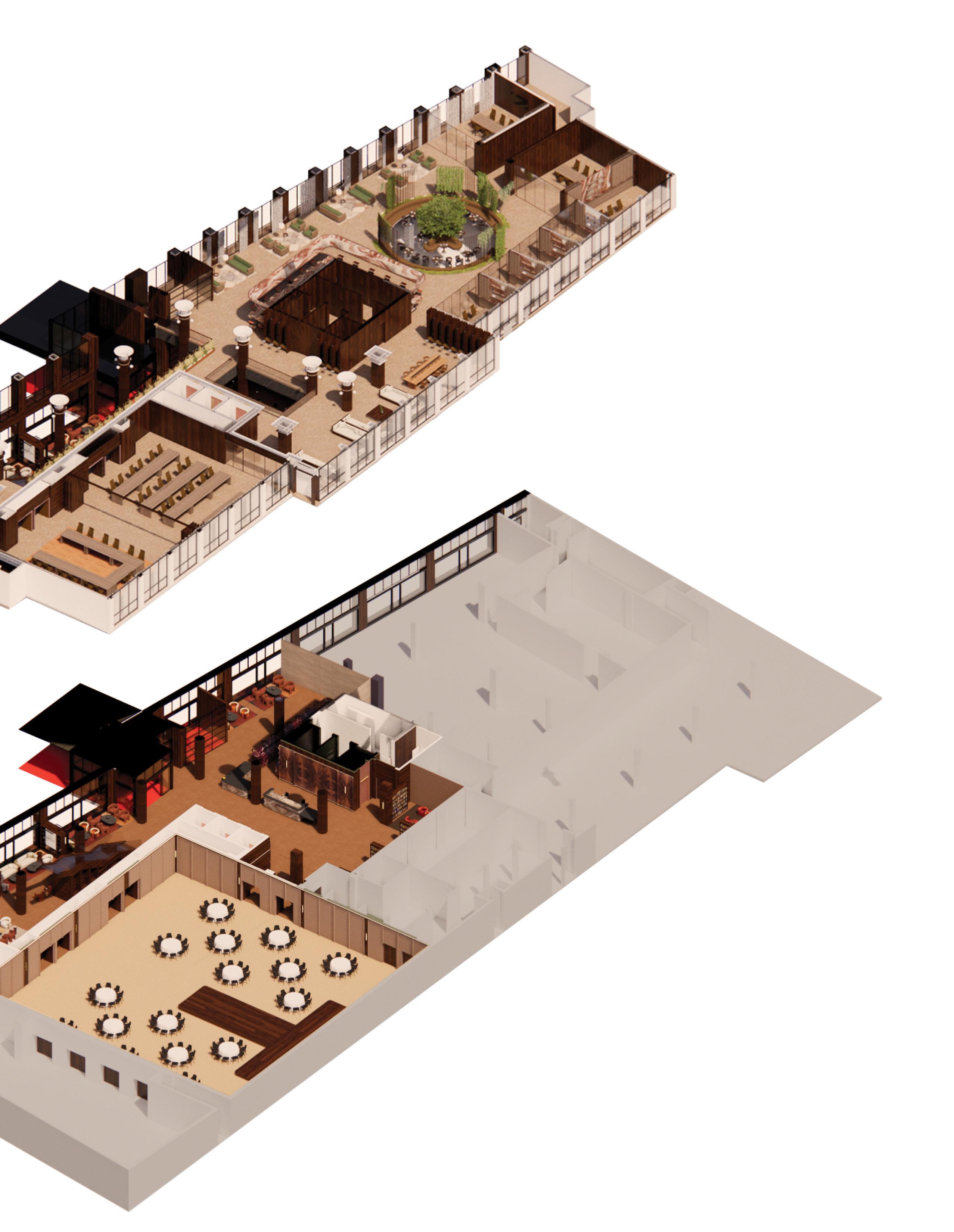The duplex strategy separates yet connects social, dining, and private functions across two levels. Public amenities anchor the lower floor, while elevated lounges and courtyard spaces create a more intimate atmosphere above. The sectional relationship allows visual continuity and circulation flow, reinforcing a seamless transition between work, leisure, and social engagement.