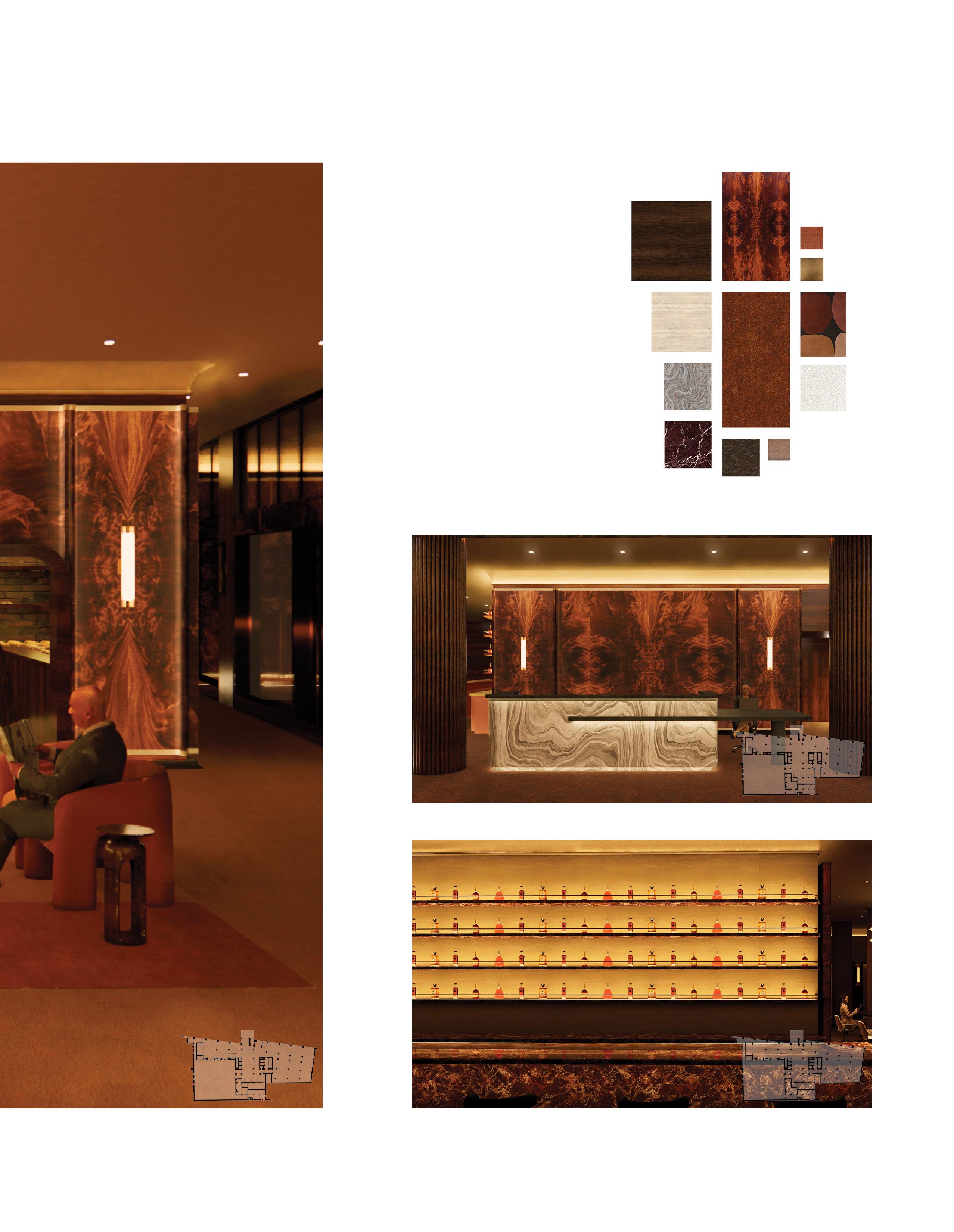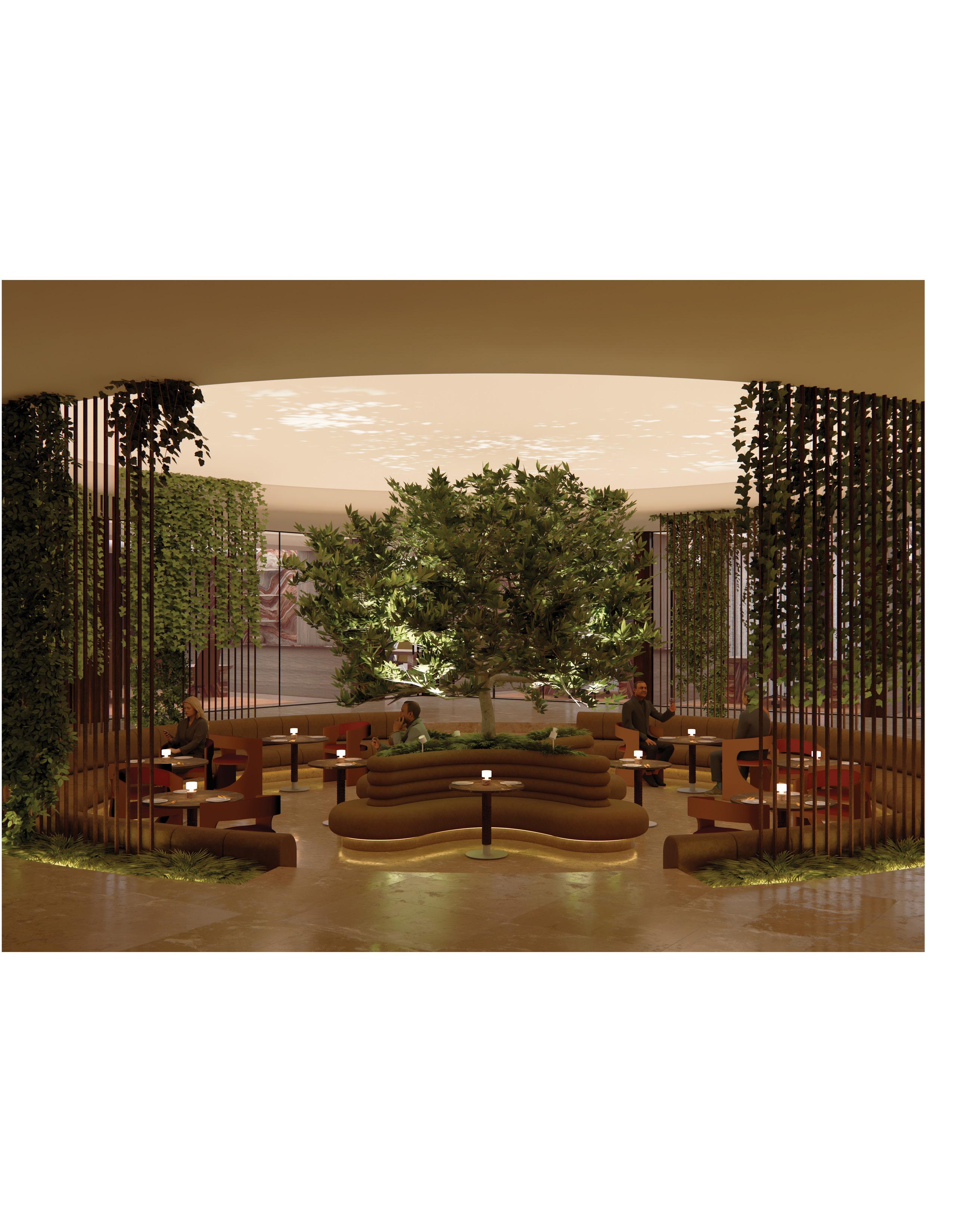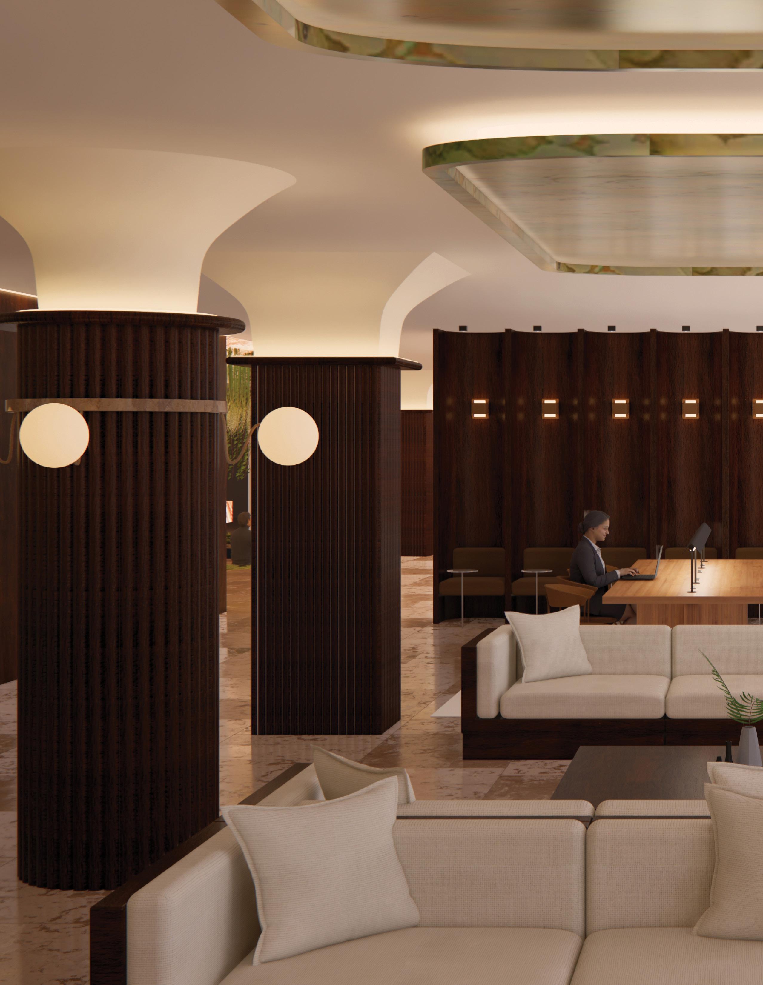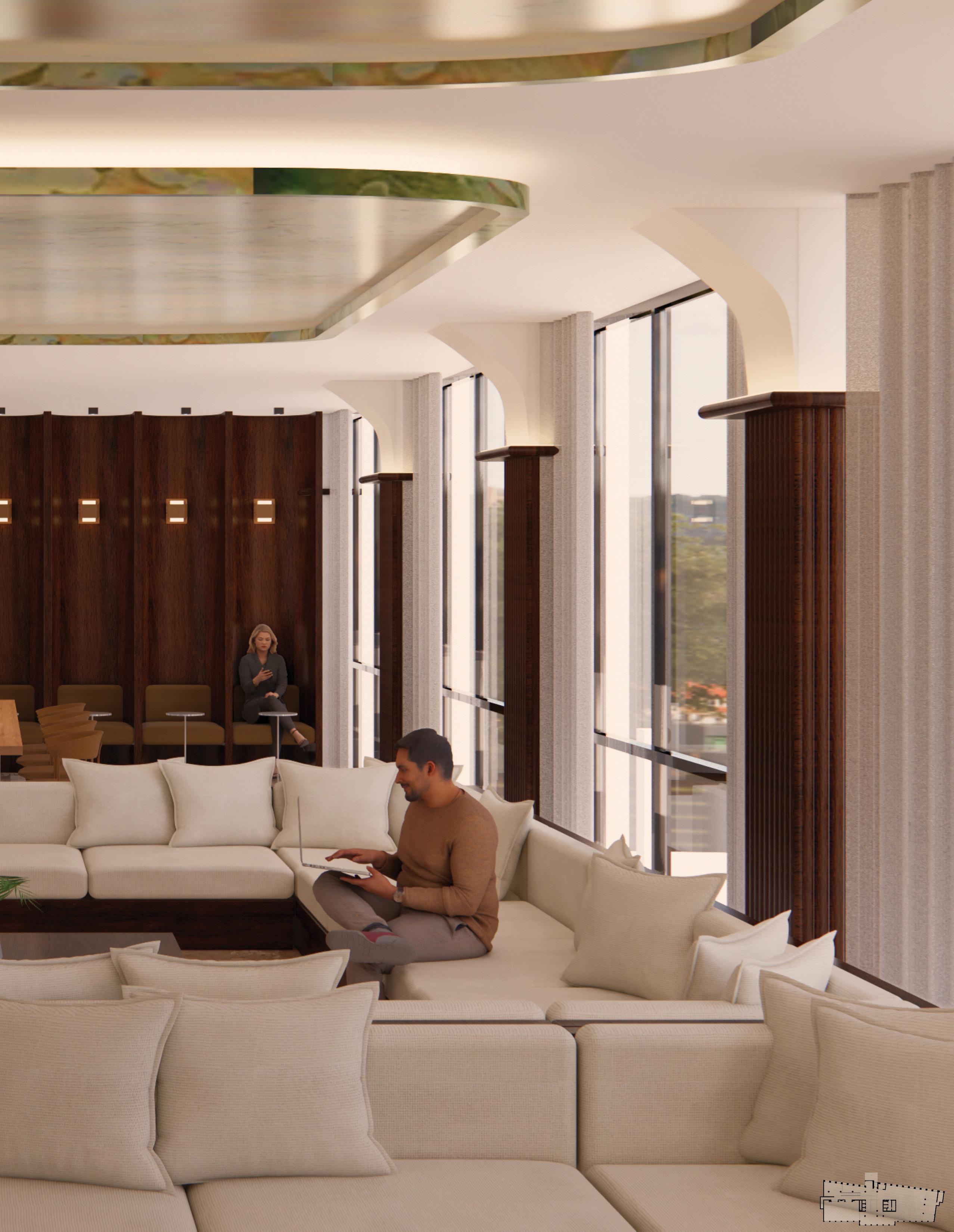 The duplex strategy separates yet connects social, dining, and private functions across two levels. Public amenities anchor the lower floor, while elevated lounges and courtyard spaces create a more intimate atmosphere above. The sectional relationship allows visual continuity and circulation flow, reinforcing a seamless transition between work, leisure, and social engagement.