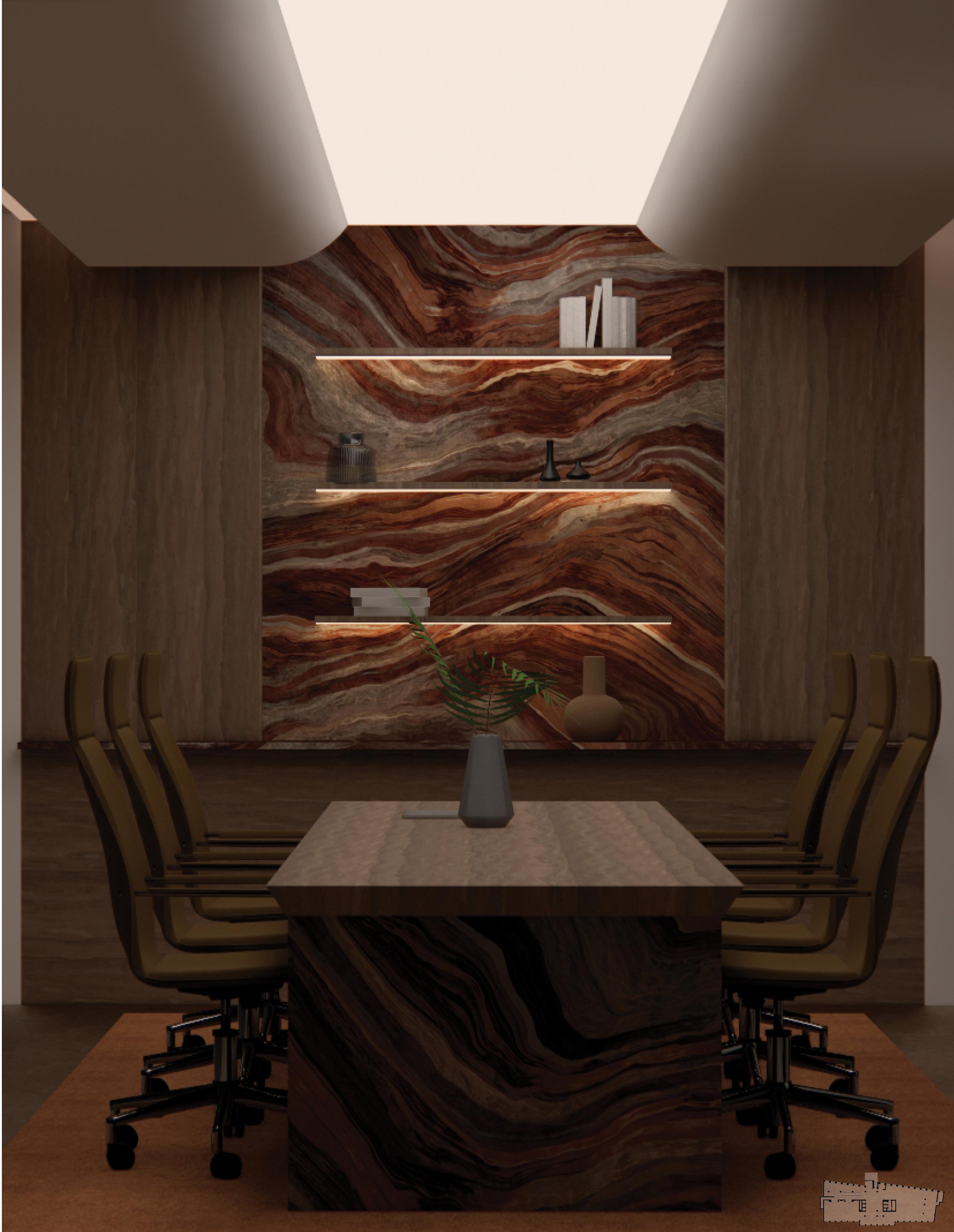 Meeting and private dining rooms are composed with restraint and material depth, framed by continuous wood paneling and expressive stone surfaces.