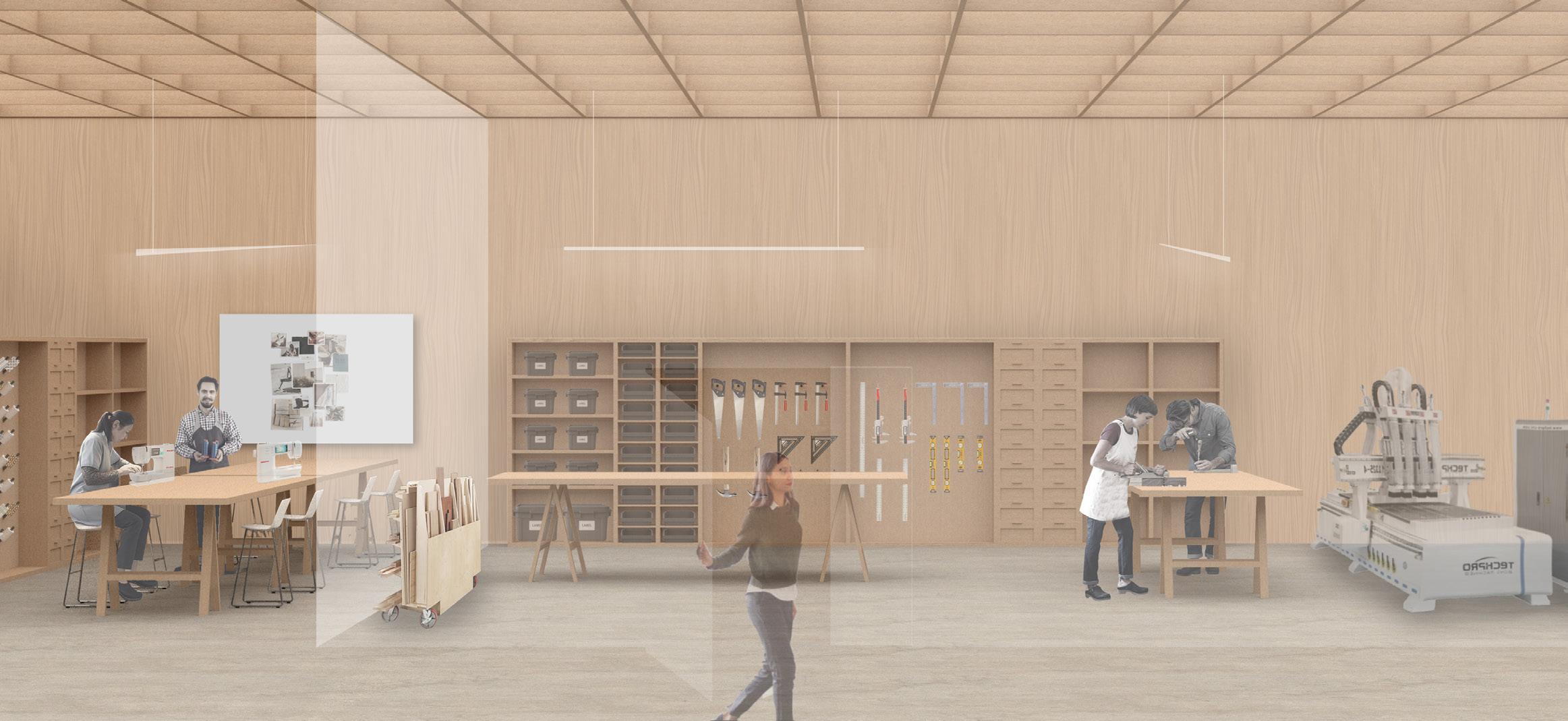 The library expands beyond reading into an active environment of making and collaboration. Fabrication tables, material storage, and digital tools are positioned in open view, allowing creative processes to become part of the public experience.