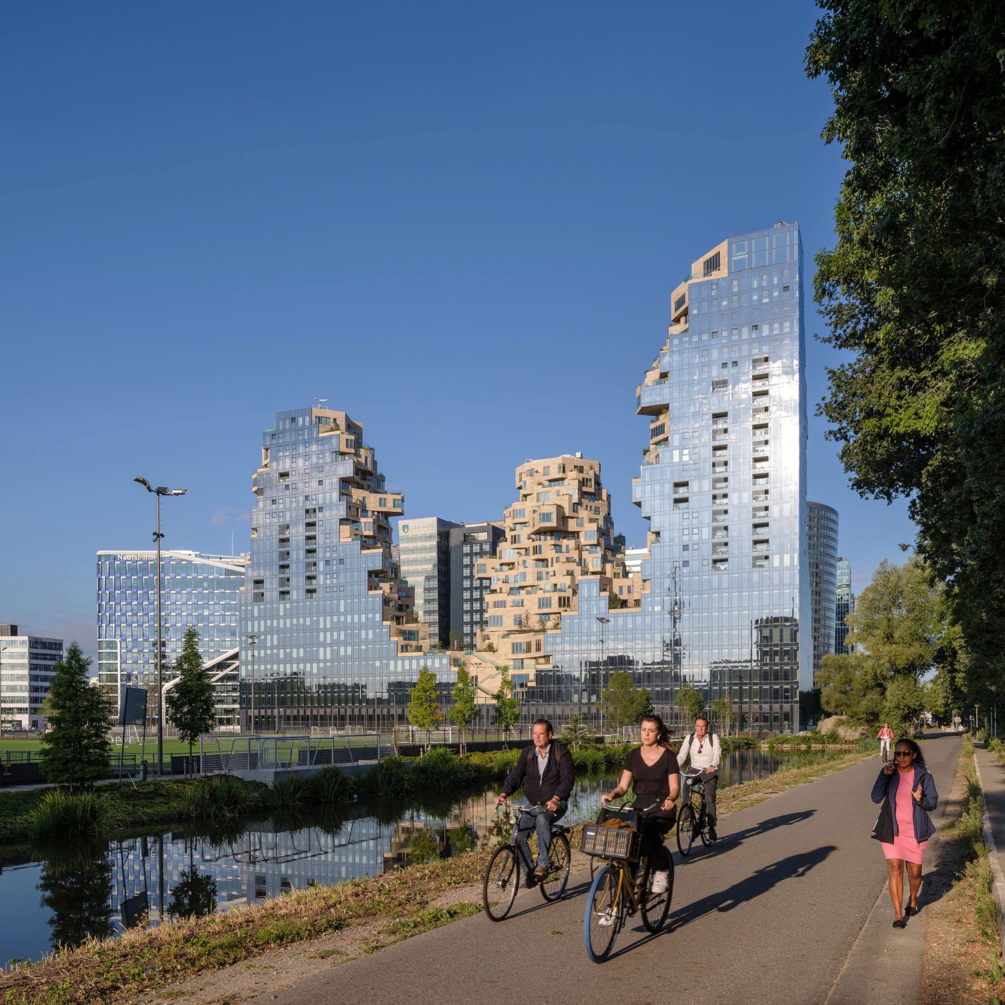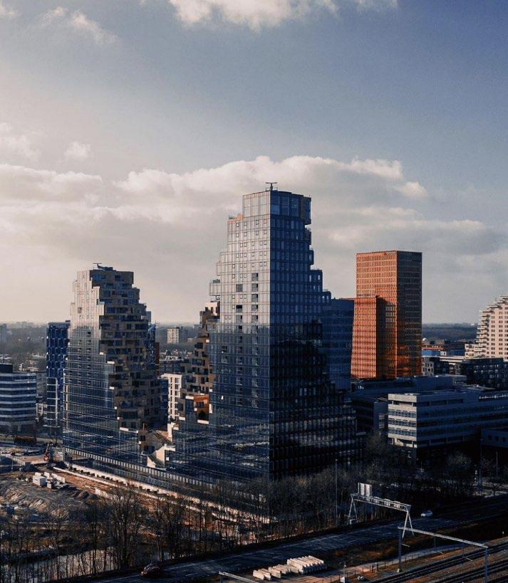 Its offices boast high floor-to-ceiling windows, large, brightly lit floorplates and fullservice amenities. The residential levels have large openable windows and sliding doors for outdoor spaces integrated within the stone facades. Full glass railings protect residents against wind and sound without impeding on their panoramic views. The facades were defined by using a parametric tool developed in collaboration with Arup Amsterdam. This allowed for much needed real-time control over quantities of daylight and sunlight, over structural limitations and required privacy, amongst other things (Editors 2021)