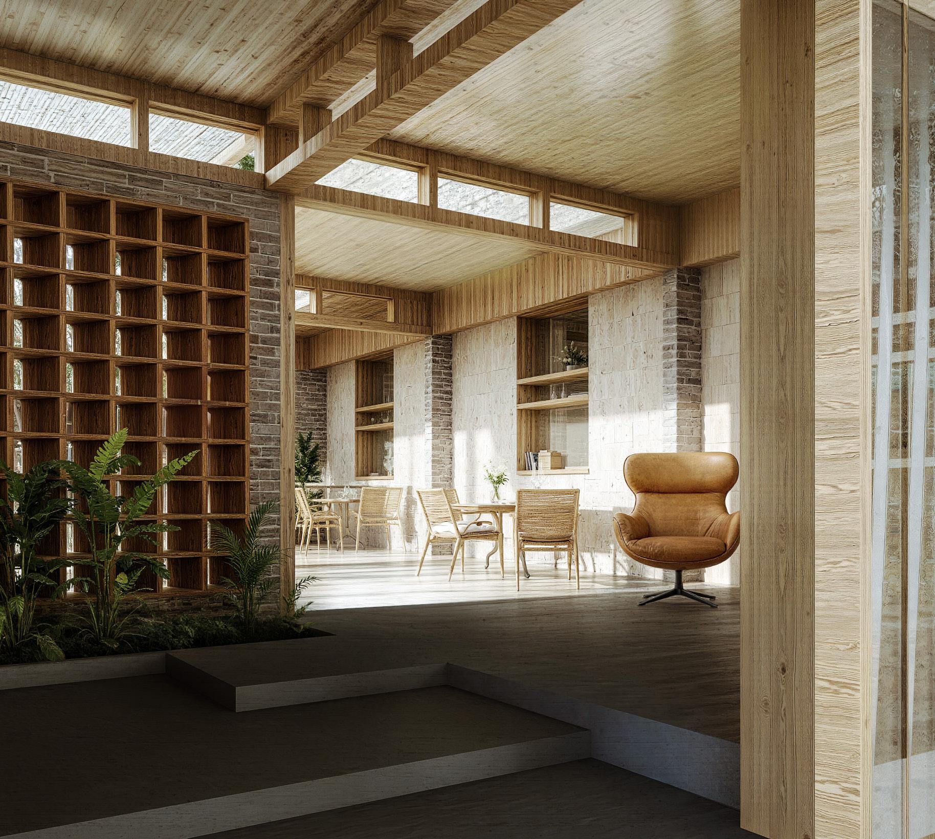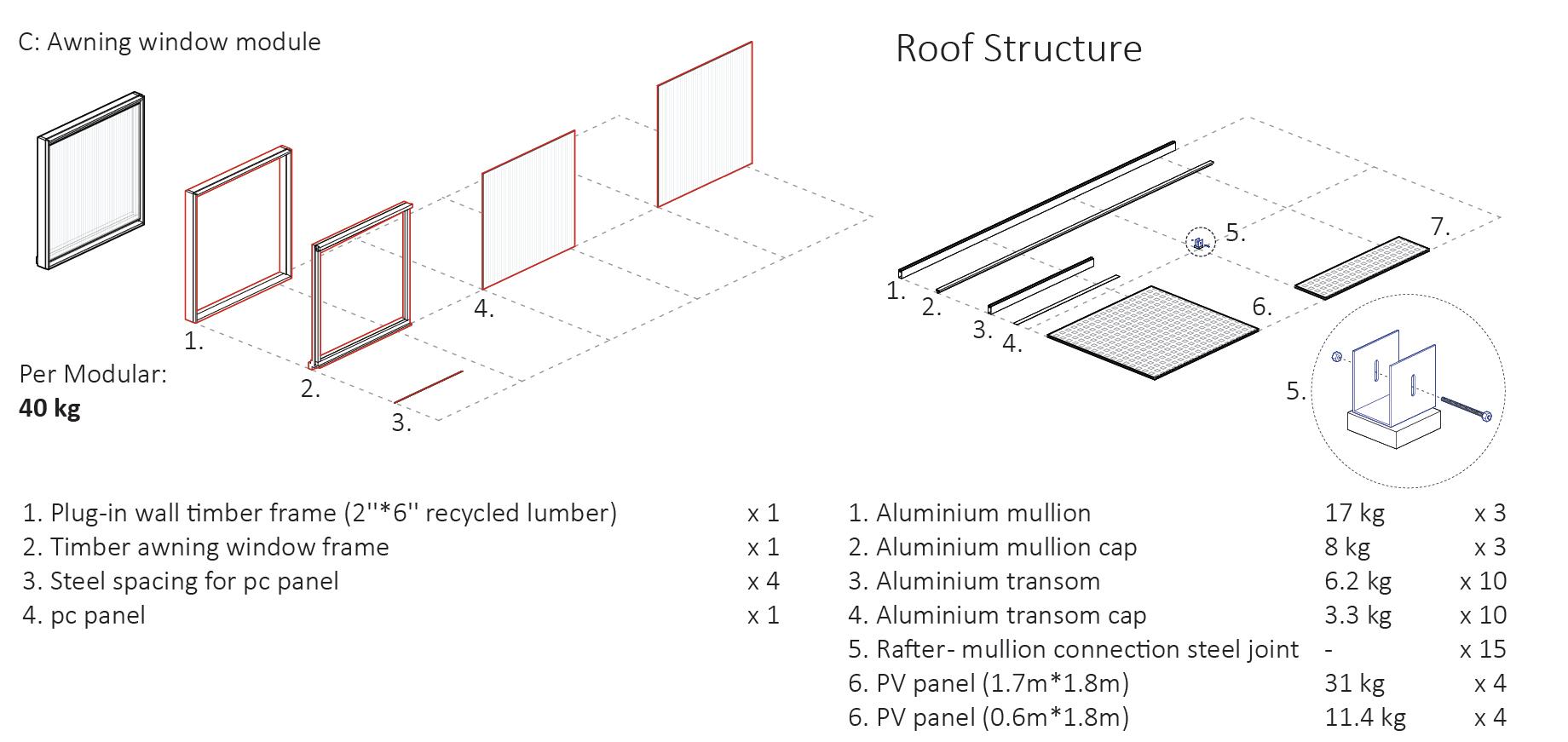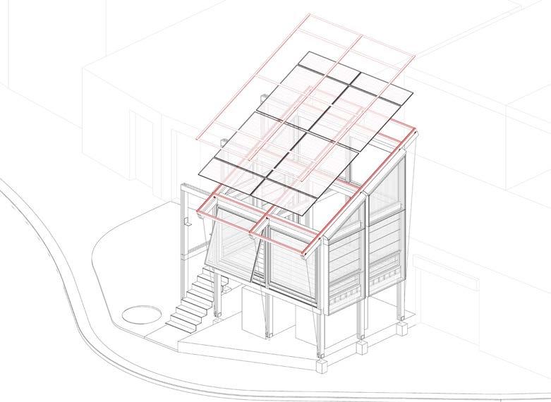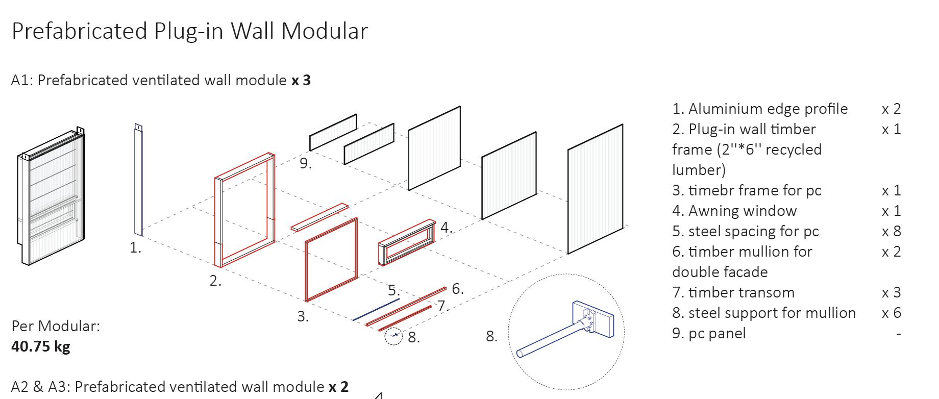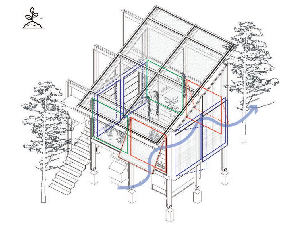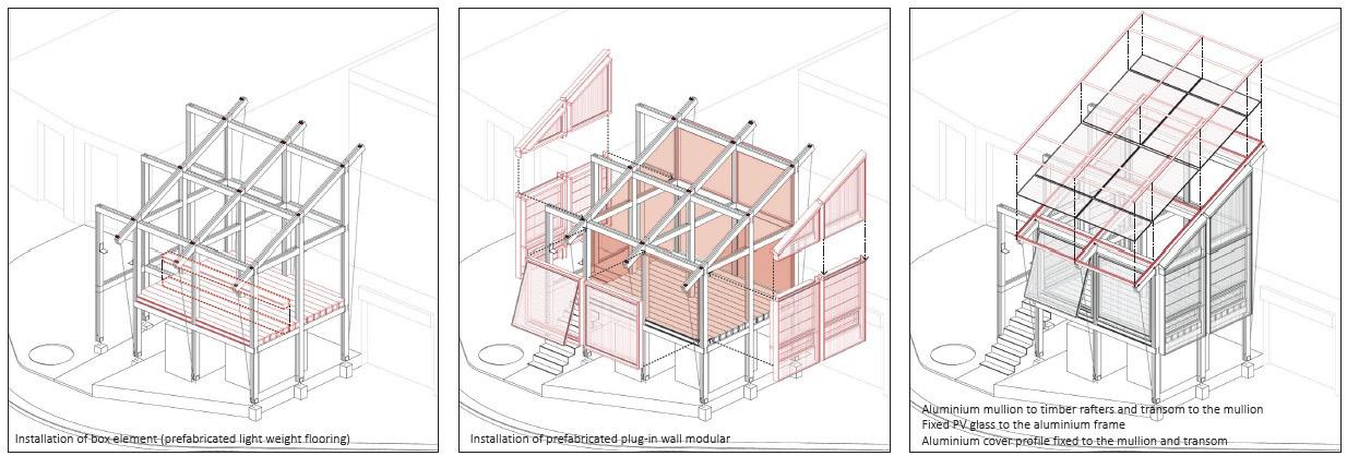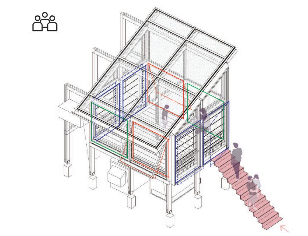 This project presents a prefabricated modular system that combines timber frames, recycled lumber, polycarbonate panels, and aluminium profiles into ventilated walls, closed wall modules, and awning windows, ensuring natural ventilation, daylight, and thermal comfort. A photovoltaic glass roof integrates renewable energy while supporting climate control, making the structure both sustainable and adaptable.