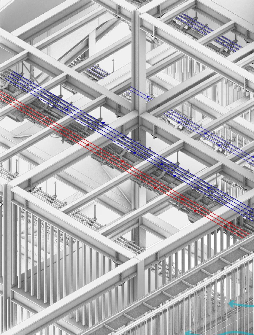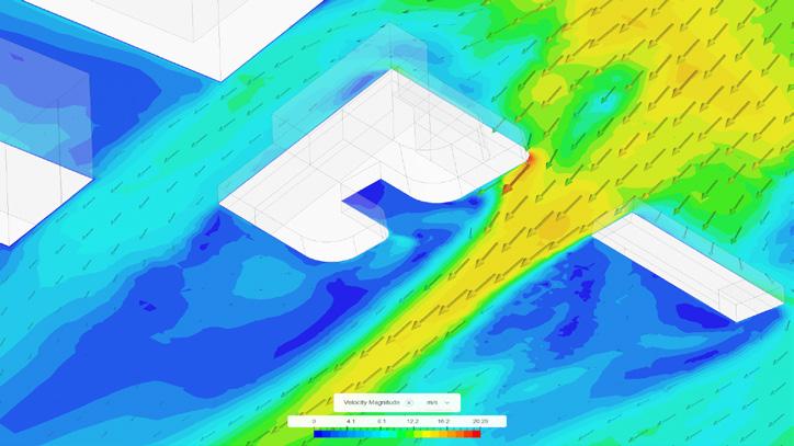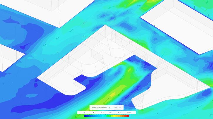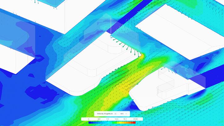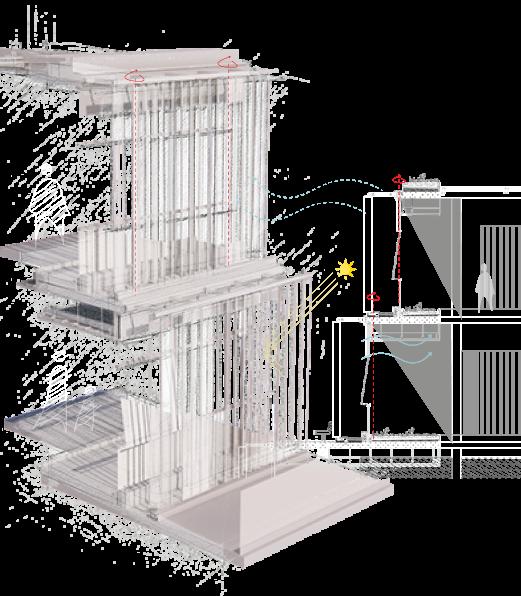The kinetic façade enhances daylight and ventilation through axis-rotating fins that modulate solar gain and airflow. Sensors track indoor and outdoor conditions, transmitting data to a central controller that synchronizes system performance.