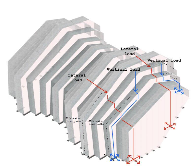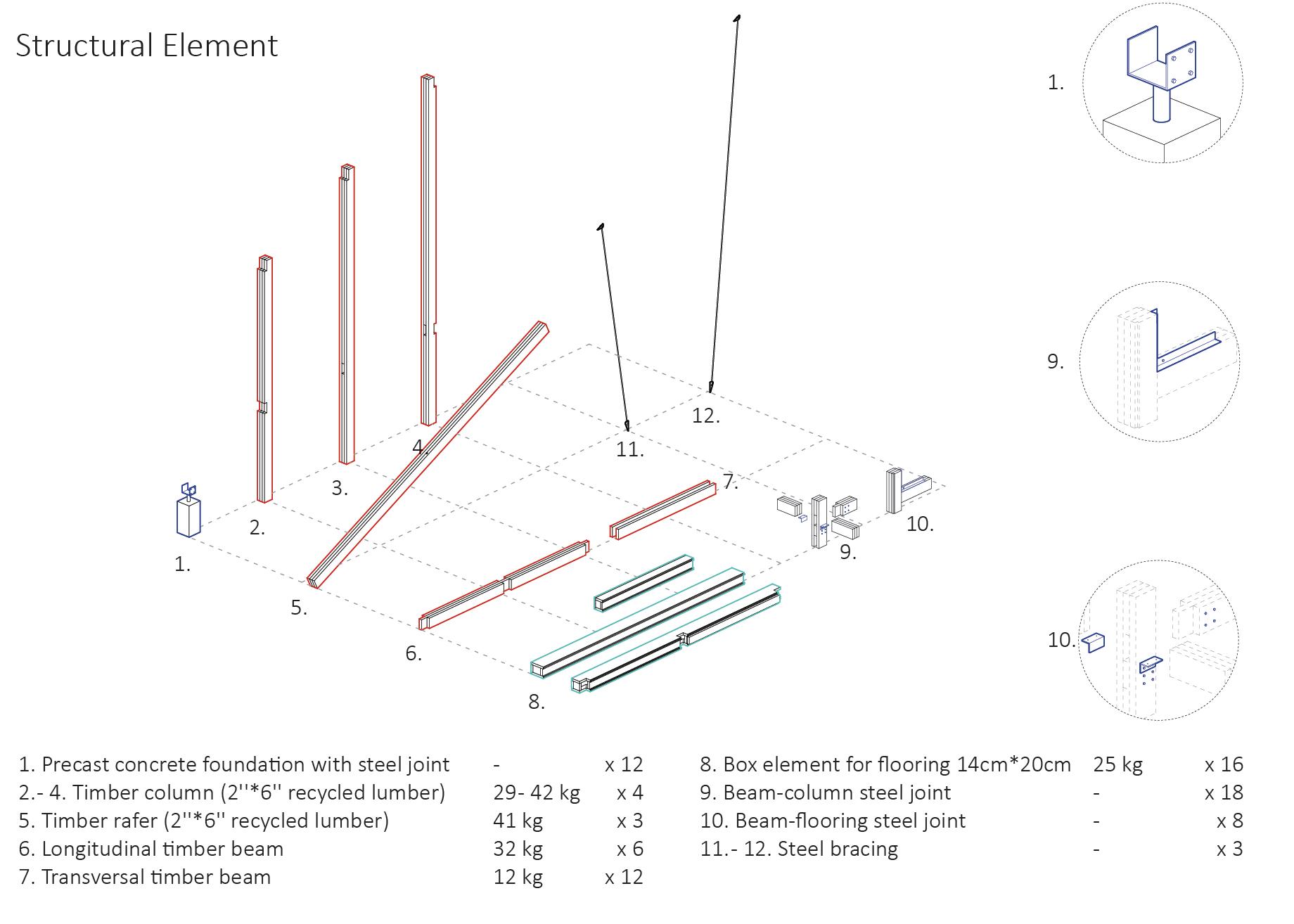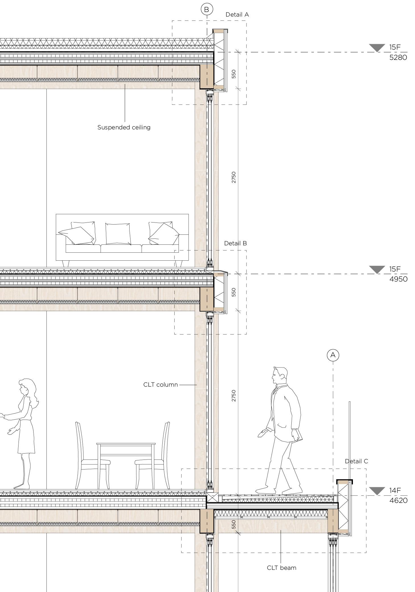 The structure consist of clt beam, colum and concrete load-bearing wall.