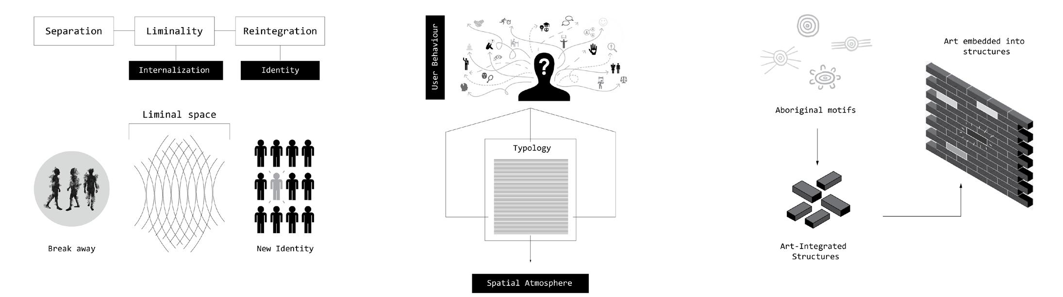 Rituals act as a means of reshaping identity. Users pass through three symbolic stages: separation from their roles, immersion in a liminal space of cultural creation, and reintegration into the community with renewed identity. Through spaces of separation, creation, and reintegration, the architecture guides users on a sensory journey—shifting from dark to light, rough to smooth, enclosed to open.