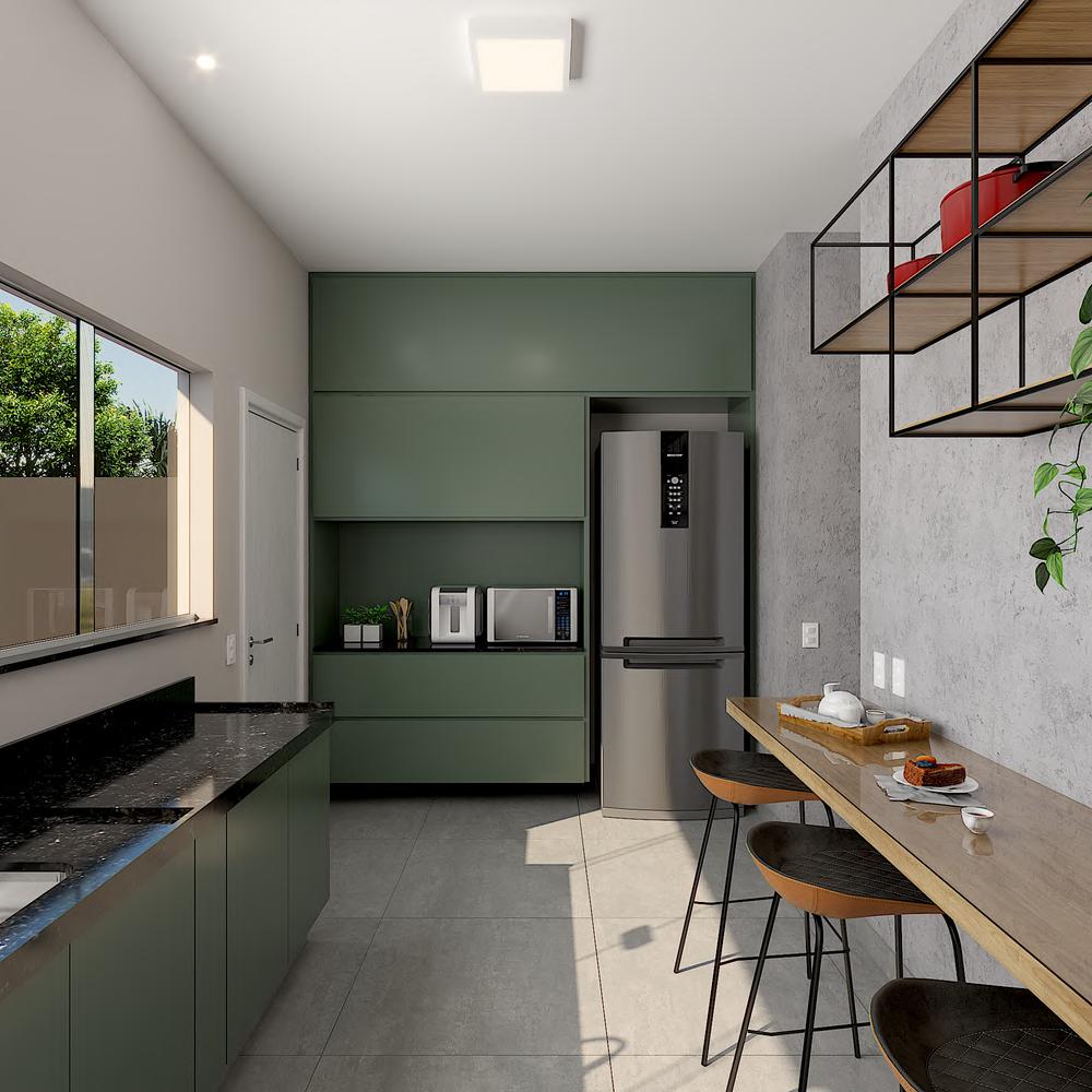 No projeto de uma cozinha com tons verdes, desenvolvido por mim, utilizei as ferramentas do SketchUp, V-Ray e Photoshop para criar um espaço acolhedor e funcional em uma casa compacta. Por meio do SketchUp, pude modelar os elementos da cozinha com precisão. Com o V-Ray, explorei a iluminação e materiais para criar uma renderização realista, ressaltando texturas e detalhes e por fim, o Photoshop foi utilizado para aprimorar a imagem, ajustandocoresecontrastes