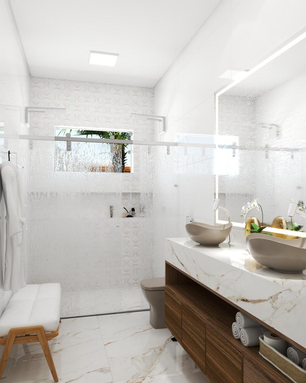 No projeto autoral de um banheiro, utilizei o SketchUp e V-Ray para criar uma renderização realista. O objetivo era destacar osporcelanatosdeumaloja,permitindoqueo cliente visualizasse como eles ficariam no ambiente Arenderizaçãoprecisaeenvolvente gerada pelo V-Ray proporcionou ao cliente uma ideia clara do resultado final, facilitando atomadadedecisões.