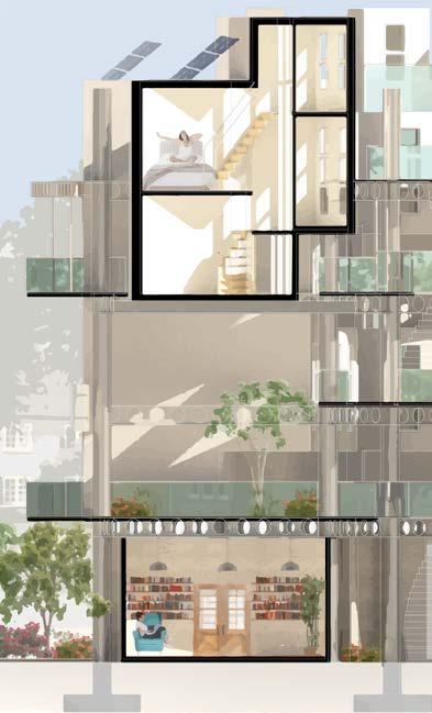 Each apartment (yellow) will also benefit from a combination of pri vate balconies and a shared rooftop garden which are designed to bring the balance into working and living side-by-side.