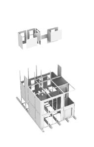 Convertible change is promted by alterations in social demands and occupan cy. With every new dweller there are changing working demands depending on the type of project they are working on. Therefore the size of workspace might change as well the layout. Additionally, depending on the number of people, the same convertible spaces can be used for either working or socialising. The primary composite beams and hollow wide columns provide a space for services to run independently from the rest of the layers, increasing the capacity for multiple conversions