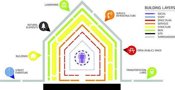 The image below shows the layers diagram. The length of arrows represents the rate of change of layers. The longer the arrow, the slower is the rate of change. For example, the “stuff“ changes at a much faster rate than the “structure“.