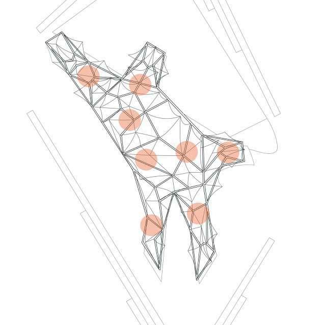 Structural Components: struts - made from 180mm x 180mm laminated Douglas Fir, each of different length; node connectors - cast spherical metal node to connect timber elements of the grid, epoxy dowelled threaded rods were used to form the connection; ply side pannels - marine grade ply was used.