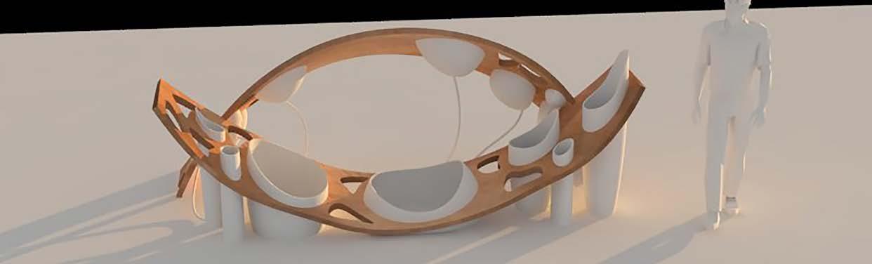 Utricularia On-land species In-water species In-water plant shape The planter consists of 2 types of pots and arch-shaped supports. Shallower pots on the upper suport designed to accomodate on-land plants. When watering, excess liquid travels to the bottom pots, where in-water plants contained. Top: Shape Development Informed by flower petals+in-water plant structure 2 Rhino model 3D printed 1:100 model