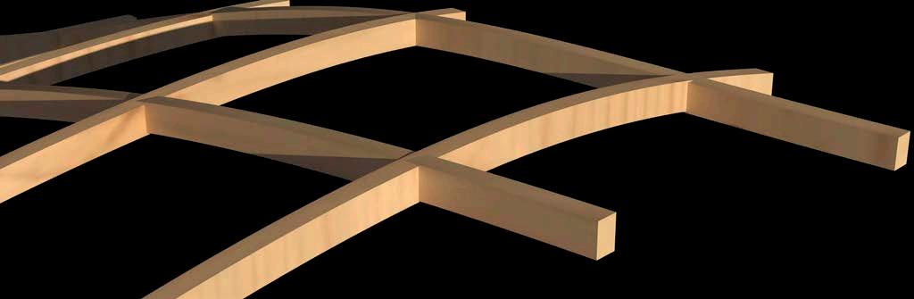 Roof top layer is supported by glulam beam structure. Glulam timber is durable but flexible enough to produce curved shapes. These parameters also mean that a single beam can be up to 30 m long.
