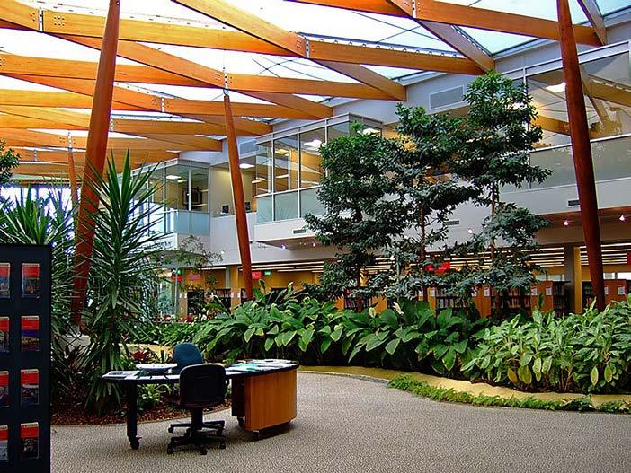 Library My idea was to make a semi-transparent roof to reduce the use of artificial lighting and to provide necessary conditions for indoor plants. Initially, roof (below) was transparent, beams were 1-2 meters apart and did not have enough support, except collumns and walls around perimeter. As beam span is quite big, collumns would have to be located every 5-6 meters to prevent roof from deflection and collapsing. I chose Ipswitch University Library as a precedent for the roof and columns. View: final roof structure + columns. I increased spacing between the columns to 4 meters and made the roof semi-transparent 23 View: initial roof structure