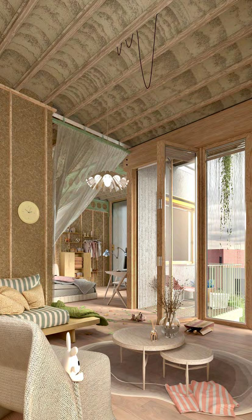 The private bedroom is conceived as a warm, flexible retreat defined by natural materials and soft light Exposed timber framing, textured fiber panels, and a gently arched ceiling emphasize material honesty and craftsmanship while creating a sense of enclosure.