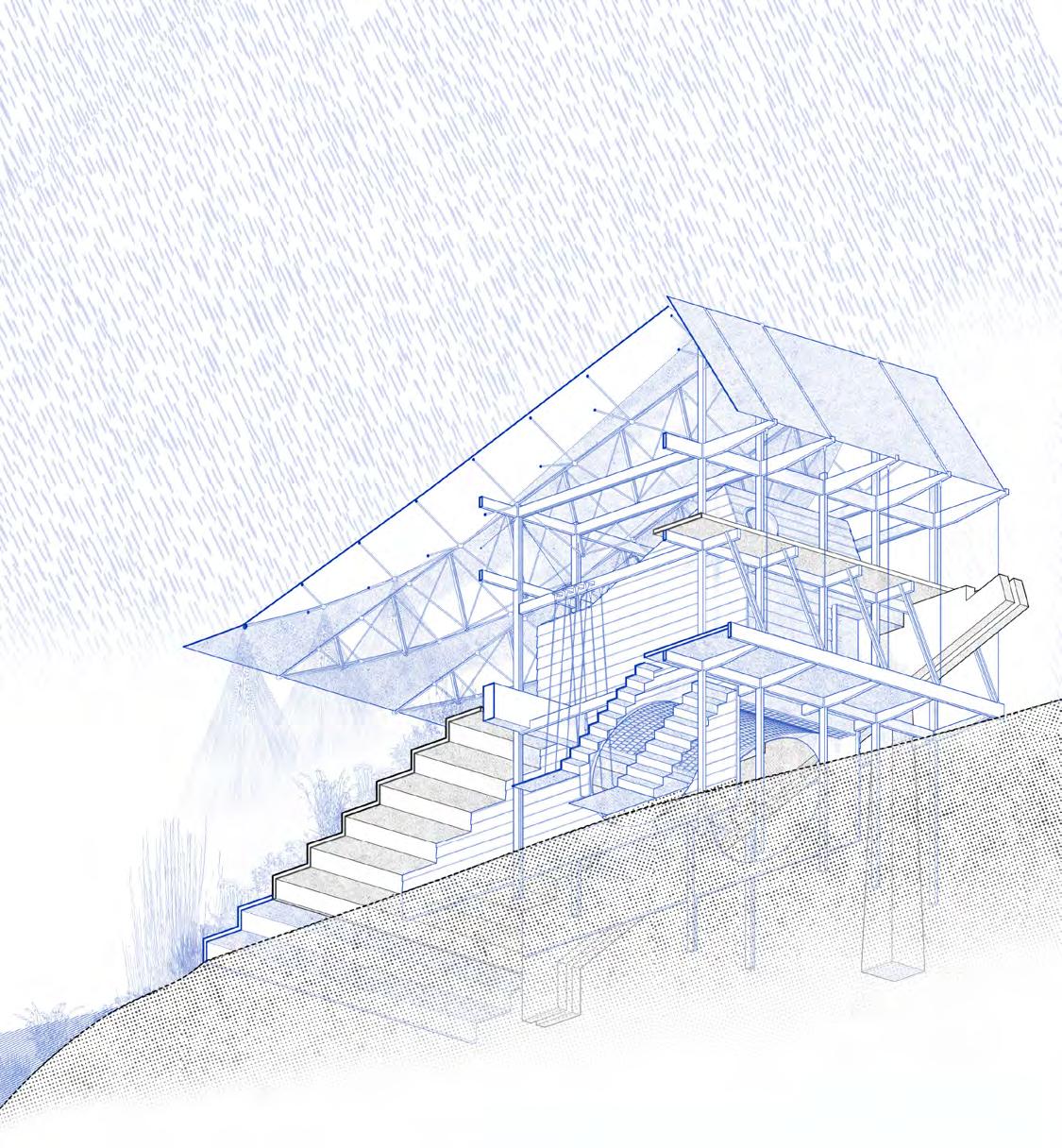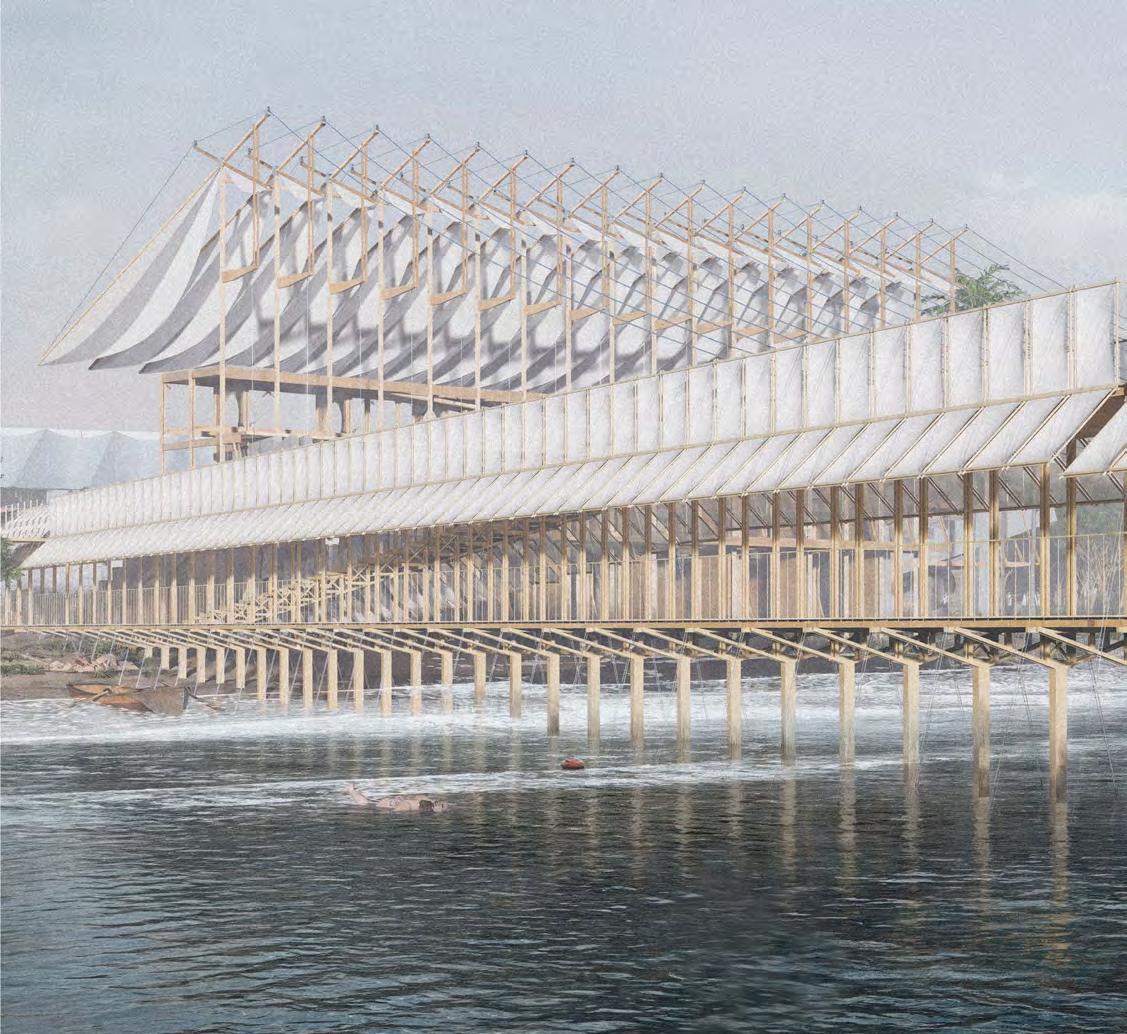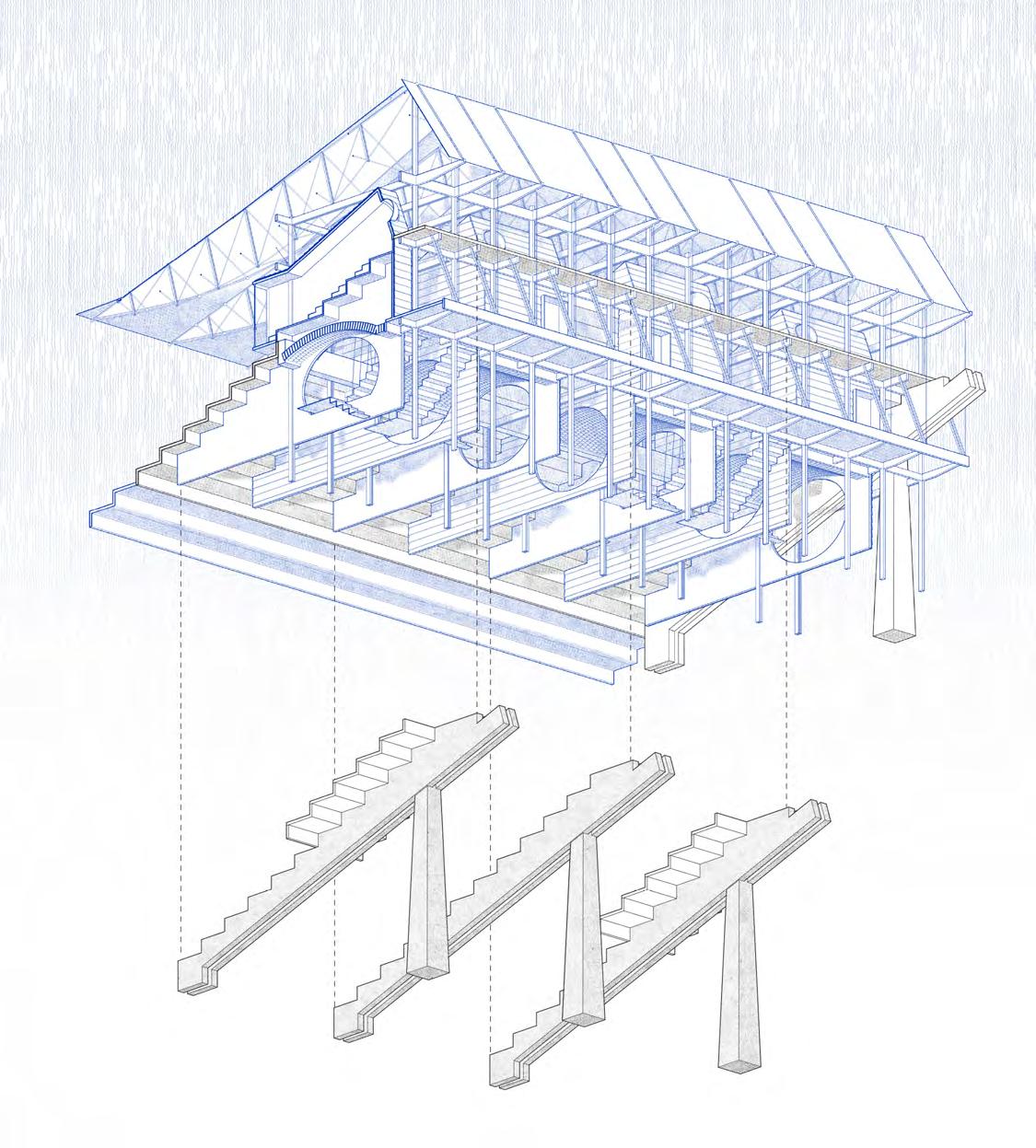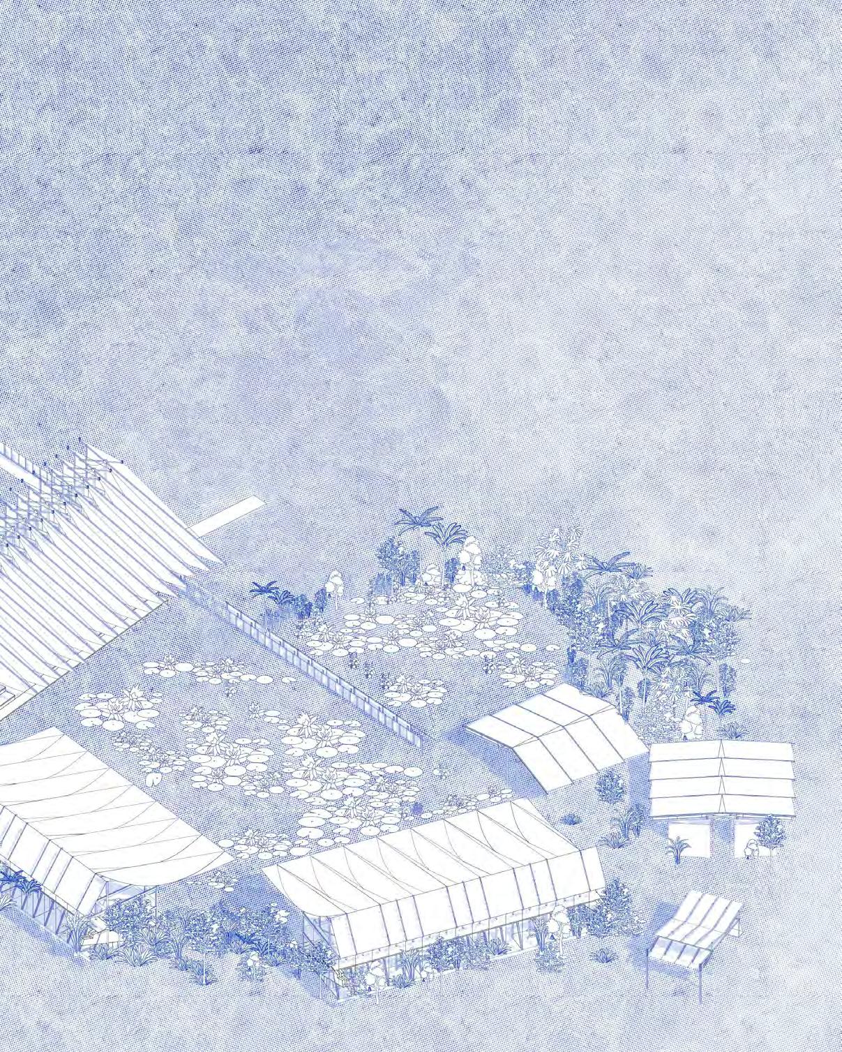 We propose an inversion of that historical hierarchy . The new architecture relinquishes its podium, descending to meet the water at its own level. It becomes a porous framework:a series of passages, platforms, and thresholds designed for subtle mediation. The rigid stage is dissolved into a wandering path that traces the land’s forgotten gradient to the mangrove.