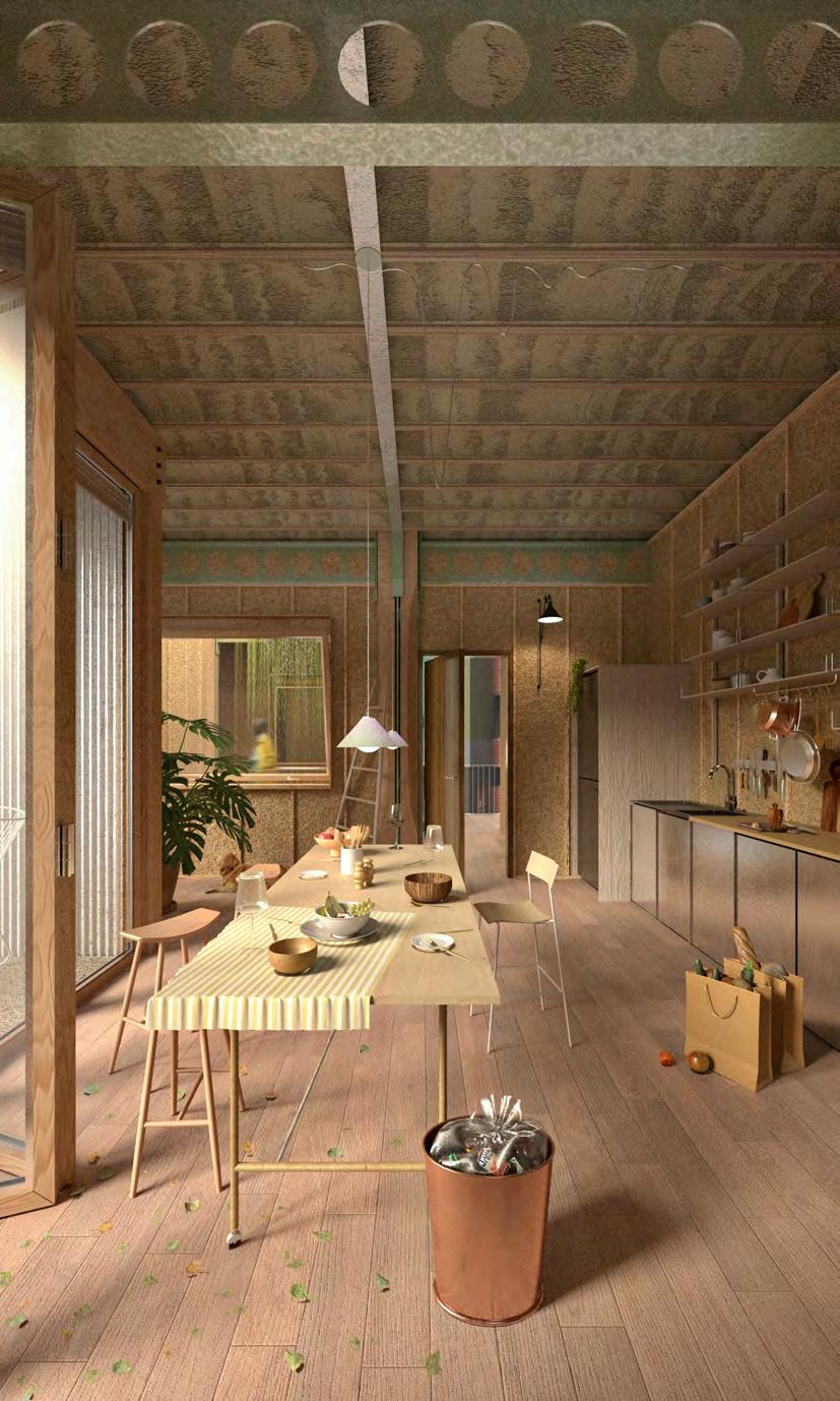 The primary structural system consists of a steel frame, complemented by shear walls constructed from recycled oriented strand board (OSB) panels, promoting both strength and sustainability. Rammed earth bricks, prefabricated using locally sourced clay, are installed between the joists. These bricks serve as thermal mass, offering excellent heat retention and contributing to passive heating and cooling throughout the year, thereby enhancing the building’s energy efficiency and environmental performance.