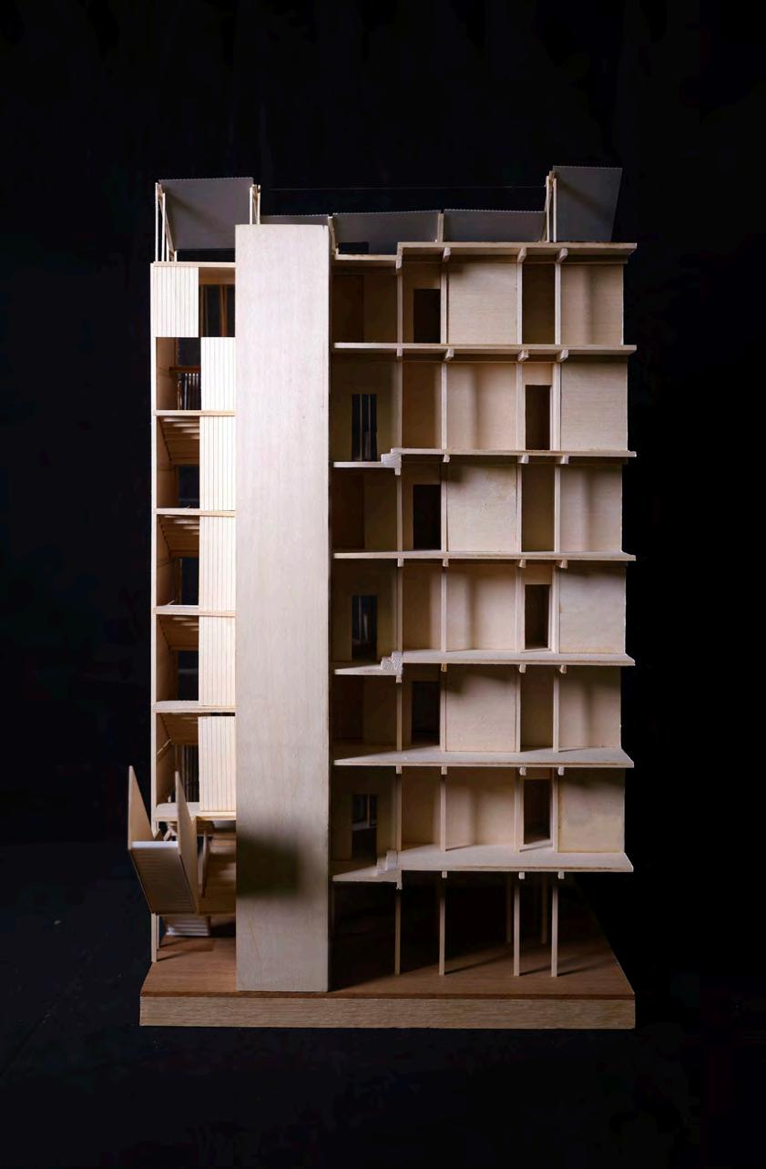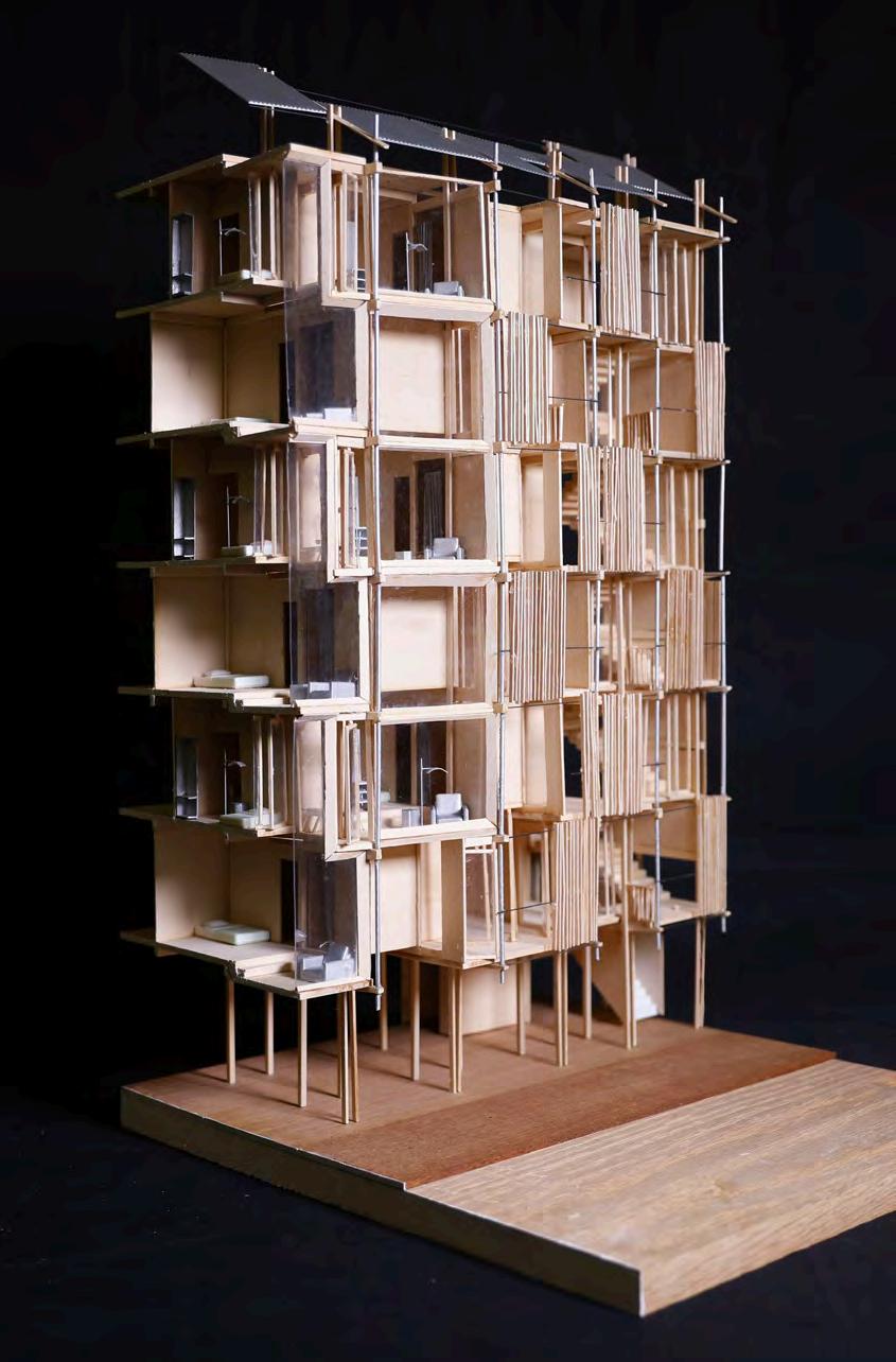 The rental single units are positioned on the northern side of the plot, facing Rivington St. They boast vertically interlocked, double-height living rooms, appealing to young renters in search of a novel residential experience.