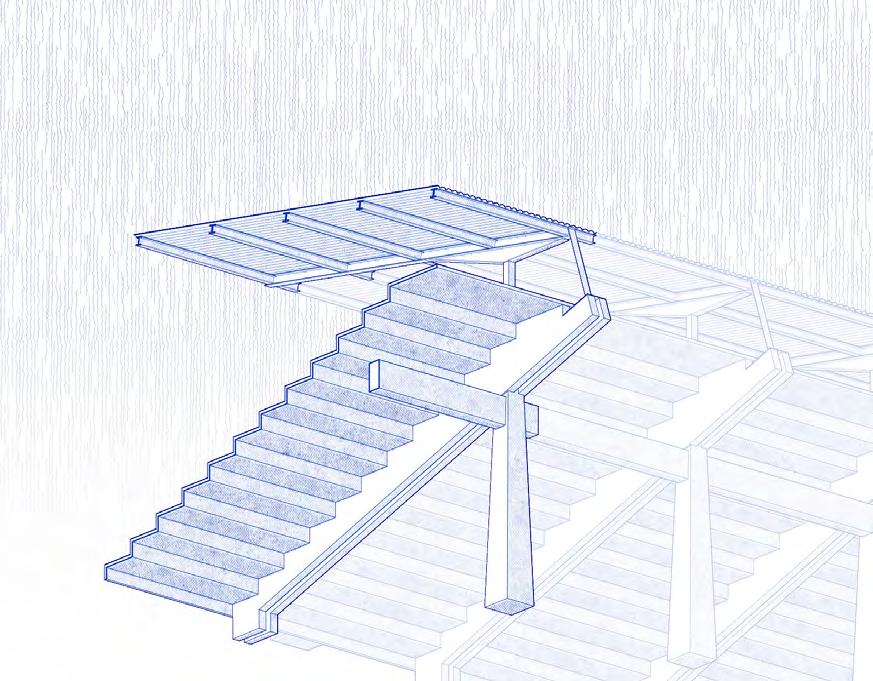On the southern bleacher, oriented toward the ocean, we reconceived the structure as a billboard that actively communicates with the waterfront. It performs a dual role—a viewing platform high above ground and a projected façade toward the sea . Its stepped geometry and elevated profile were deliberately emphasized to capture the attention of those approaching by boat , transforming it into a recognizable marker along the shoreline.