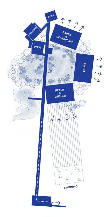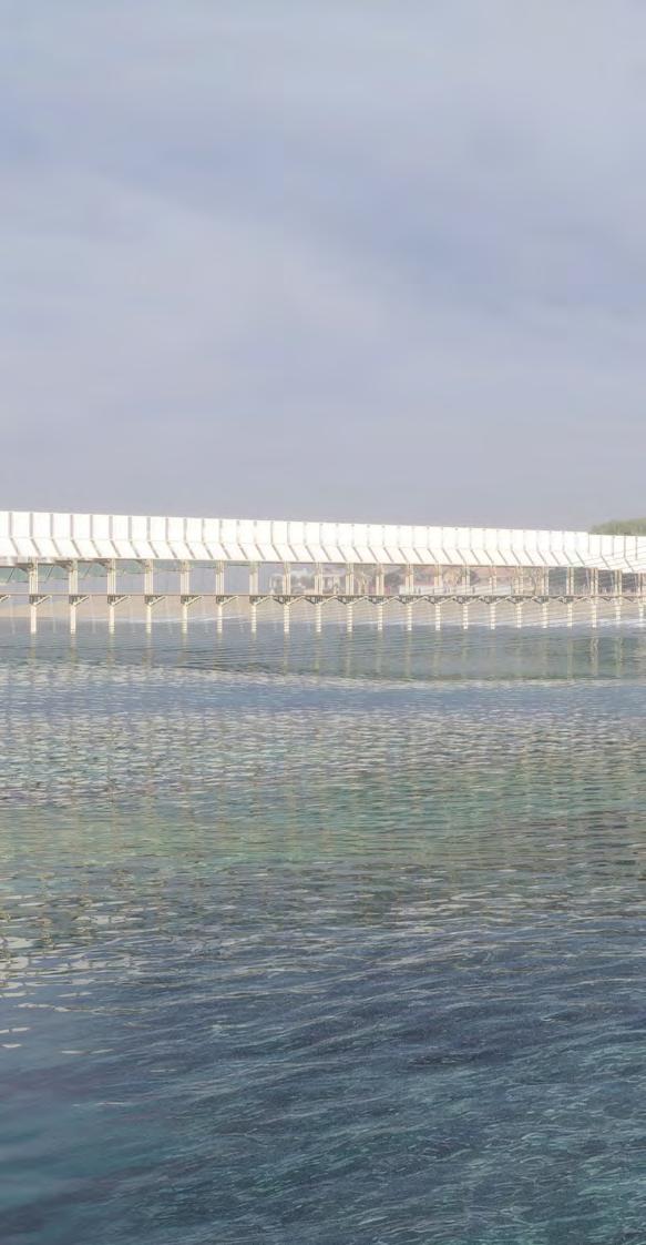 A central bridge, reclaimed from, structurally reinforced over, and extended from the former temporary buoyant bridge at the center of the dolphin pond, serves as the primary axis of the project. It guides movement from the entrance toward the ocean and ultimately connects to a slide that descends into a mobile sea pool. Because swimming in the existing ponds is prohibited, a new sea pool is introduced and enclosed by a ring of retaining stones to accommodate diving activities.