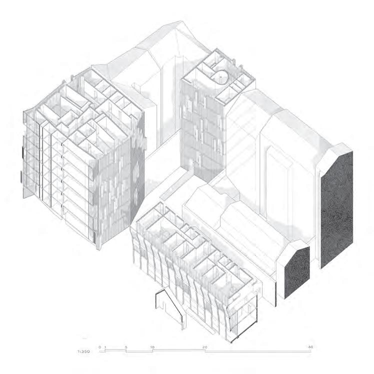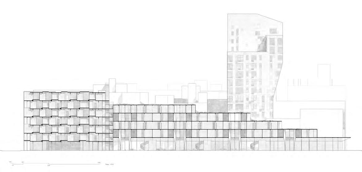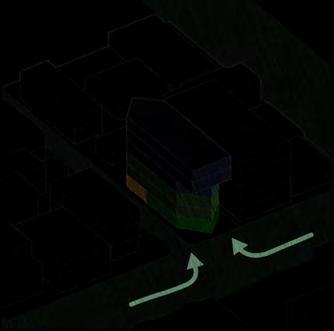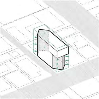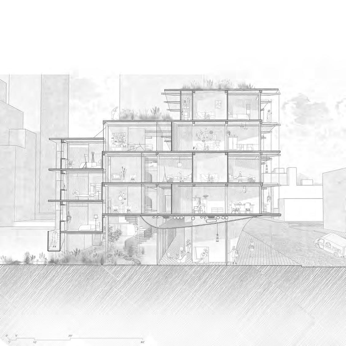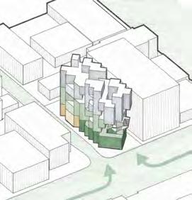 Shared Future Site C is a narrow lot in West Hollywood, oriented along a northwestsoutheast axis. Its immediate adjacency to two prominent urban passageways calls for a responsive and engaging architectural solution. This can be achieved through deliberate massing and thoughtful articulation of the façade to create an inviting presence within its dynamic context.