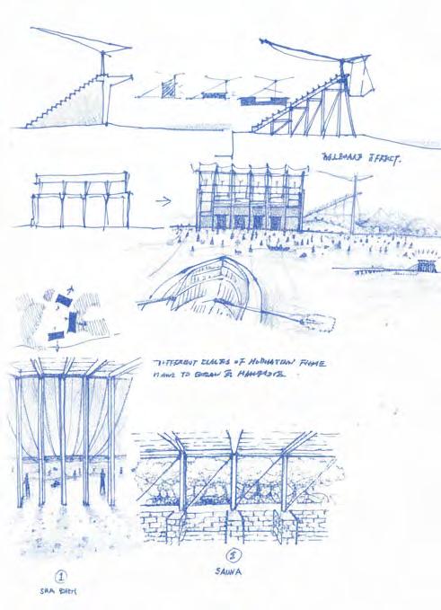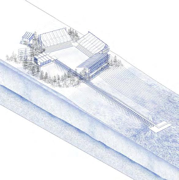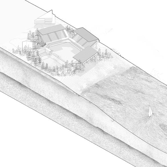The bleachers are no longer objects for spectacle but are enveloped with native vegetation, dissolving their hard edges back into the landscape. Within this re-greened landform, we have inserted four submerged sauna rooms, using the existing staircases for access to create intimate, sensory experiences focused on the natural environment.