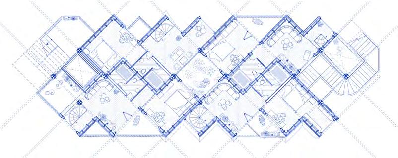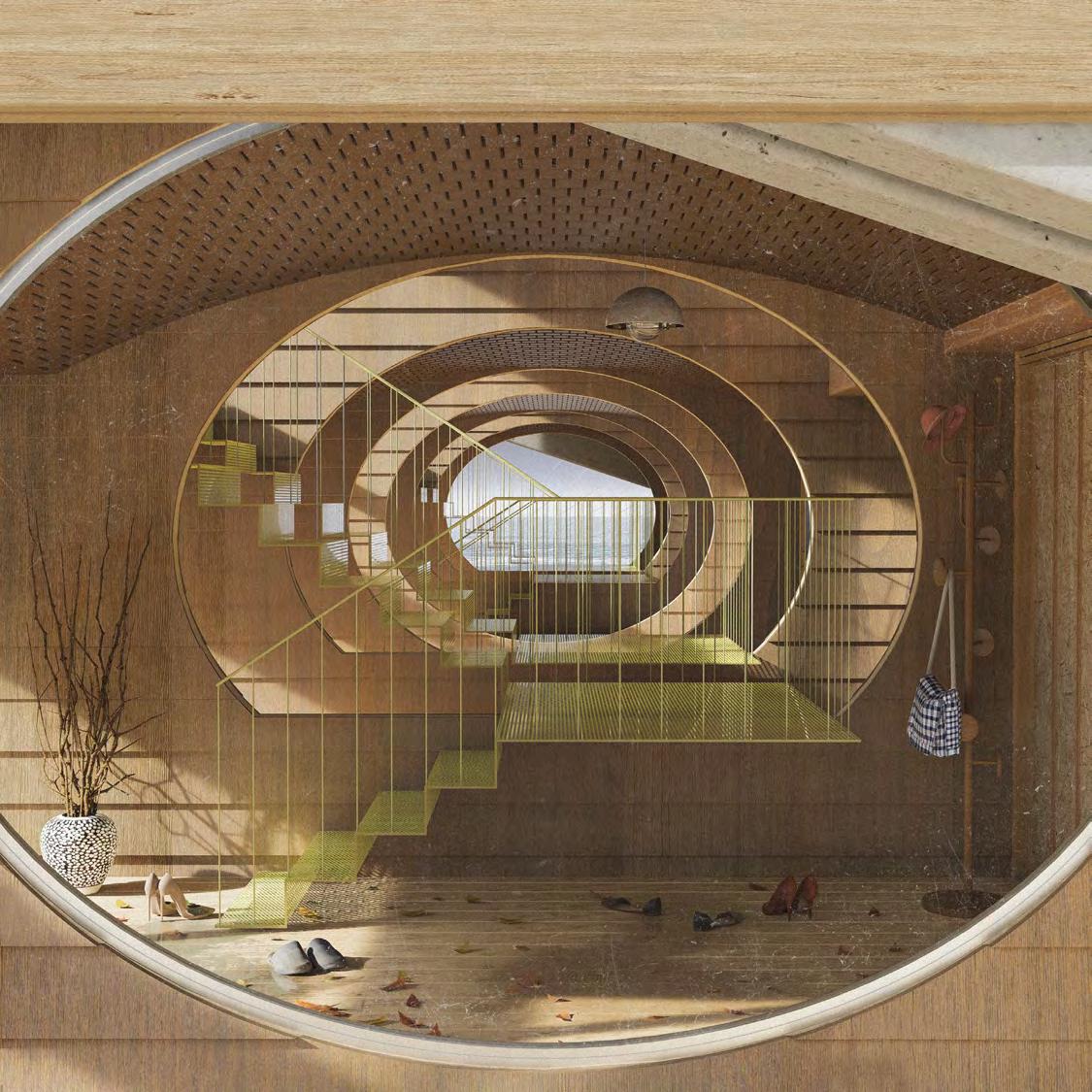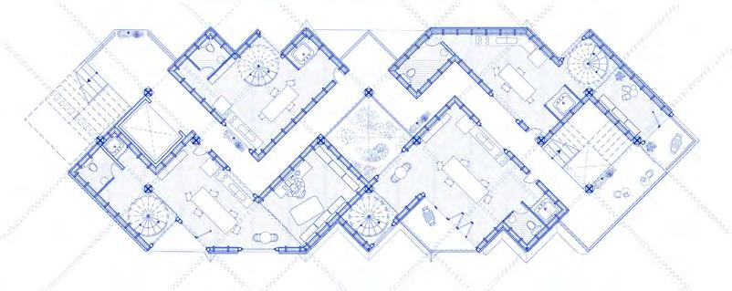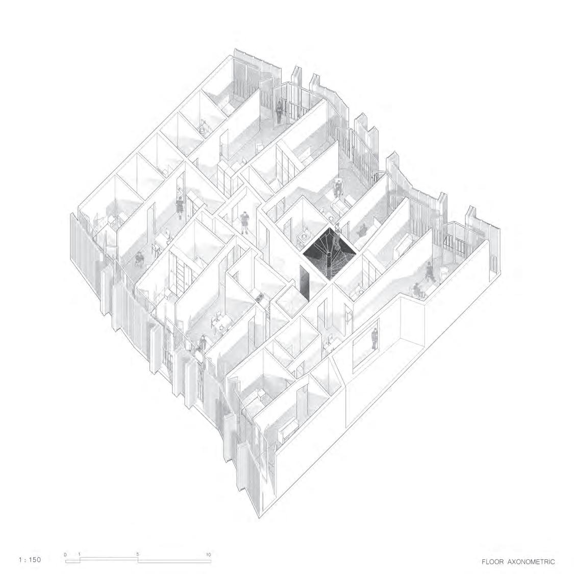 The defining communal spine is a zigzagging corridor that weaves vertically around skylights on alternating floors, drawing daylight deep into the plan and creating a rhythm of illuminated spaces. With two access points per level, this path enhances orientation and accessibility. Its dynamic geometry naturally slows movement, forming informal gathering pockets that foster unplanned encounters. Functioning as a social condenser, it acts as a vertical street that encourages connection and dialogue among residents.