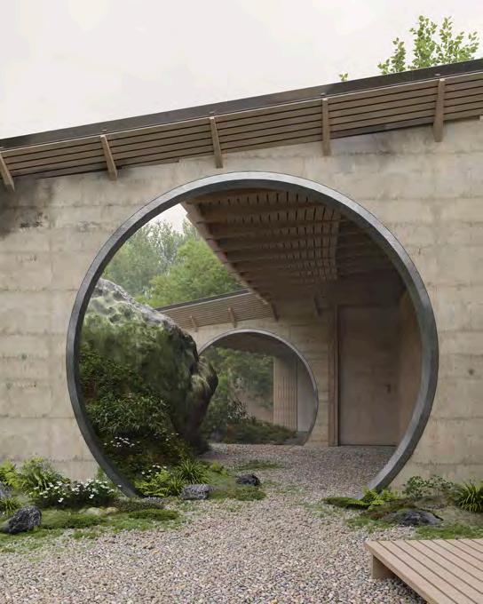 Stepping into the curated threshold, where a delicate cleansing drip channel at each house's backyard serves as a ritualistic portal, a veil of falling droplets that marks the transition from the outside world into a mindful sanctuary.