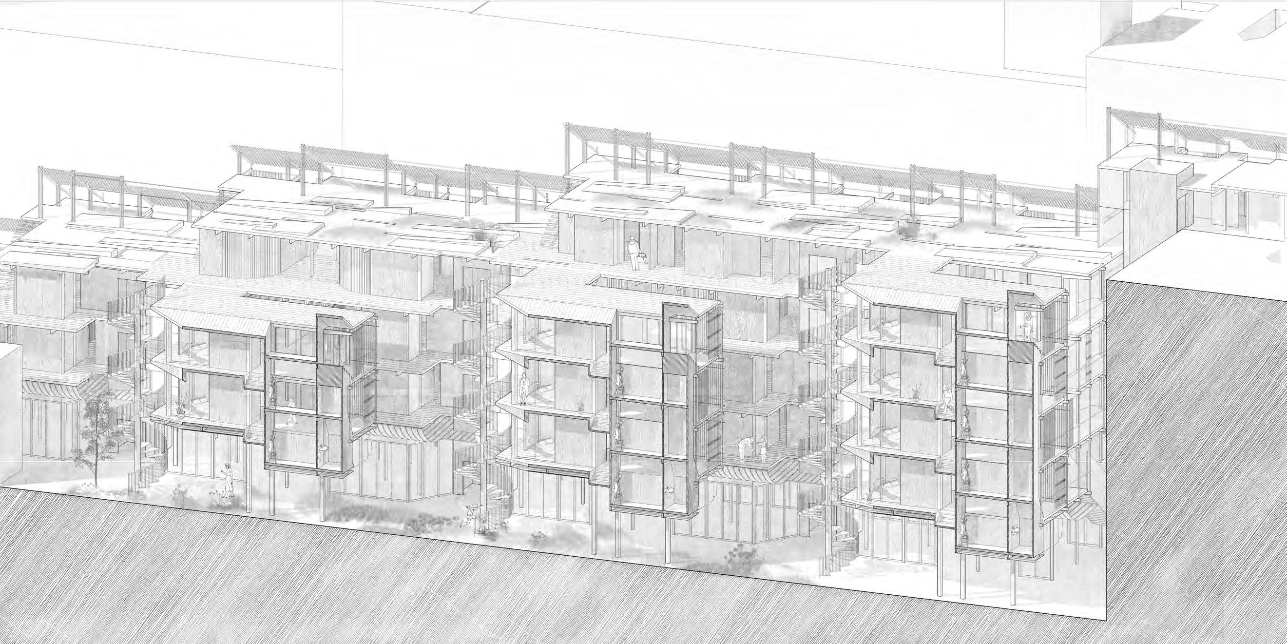 Situated in Manhattan’s Lower East Side (LES), this cohousing project draws direct inspiration from the area’s longstanding immigrant history, which has defined its vibrant, layered character over generations. Fostering an inclusive community is central to the design, which organizes three distinct residential volumes around a series of shared courtyards to accommodate diverse household sizes. These residential units, facing Essex Street, are intentionally oriented inward to promote resident interaction and a shared sense of place, supported by dedicated coliving spaces that strengthen social interconnectedness.