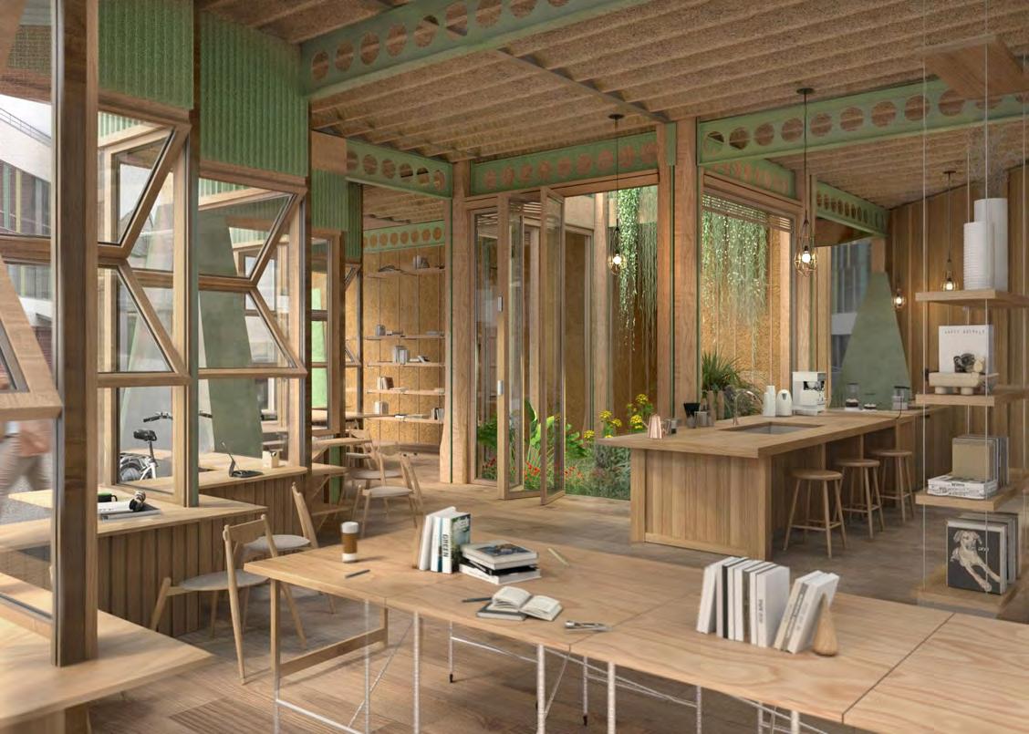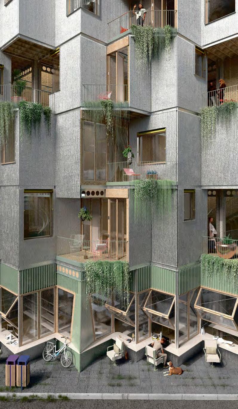 The design carefully scales the building to harmonize with its surrounding context. It comprises a mix of modular unit types— including studios, two-story one-bedroom units, and three-story two-bedroom units—for a total of ten residences. This variety supports diverse living needs while maintaining a coherent architectural volume. At ground level, the program expands to include a community library and café These amenities activate the street edge, fostering social interaction and providing shared resources that integrate the building into the daily life of the neighborhood.