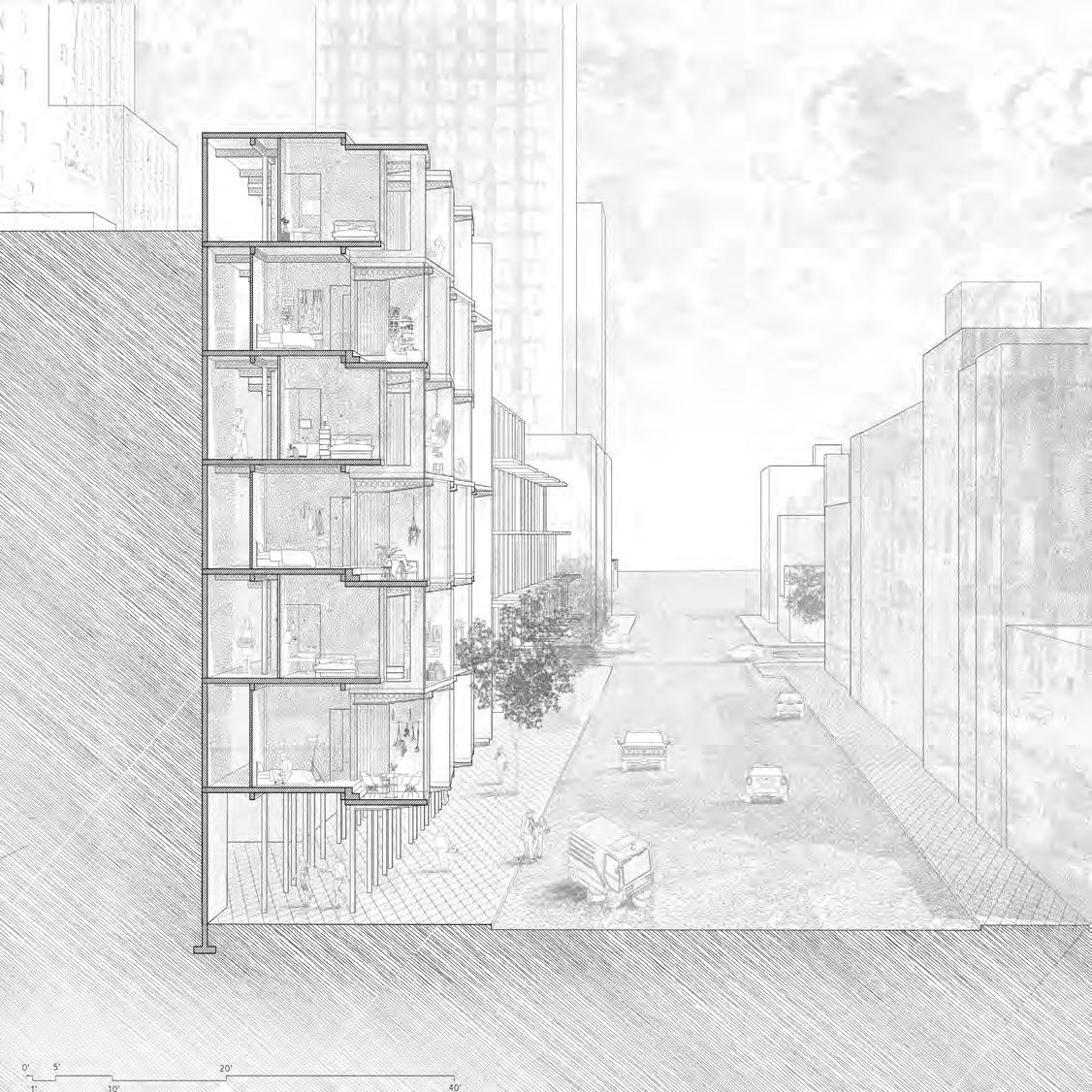 Further encouraging engagement with the urban fabric, units along Rivington Street provide residents with panoramic views, inviting them to connect visually and experientially with the neighborhood’s dynamic energy. Elevated above street level, the project’s transparent glass volume on the ground level embodies a principle of architectural and social transparency, while offering a thoughtful response to urban pressures such as gentrification. This elevated structure houses flexible commercial and communal spaces, serving as both a bridge and a beacon that physically and symbolically connects residents to their surroundings.