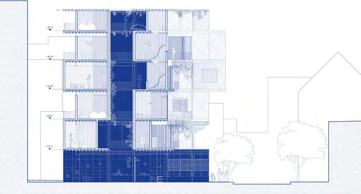 Furthermore, the interstitial zones situated between the building's primary outer envelope and the private residential units enhance both the architectural character and the practical utility of the complex. These grey spaces serve a dual purpose: they articulate the façade with depth and texture, while also providing functional buffers that improve privacy, mediate environmental conditions, and offer residents valuable semi-private outdoor areas.
