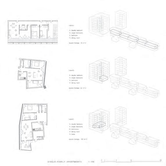 The three backside courtyards are divided by stacks of split-level co-op apartments, featuring shared living rooms and two queen-size bedrooms connected by staircases. *For a more in-depth view of these units, refer to the project's introduction page, where a detailed illustration is provided.