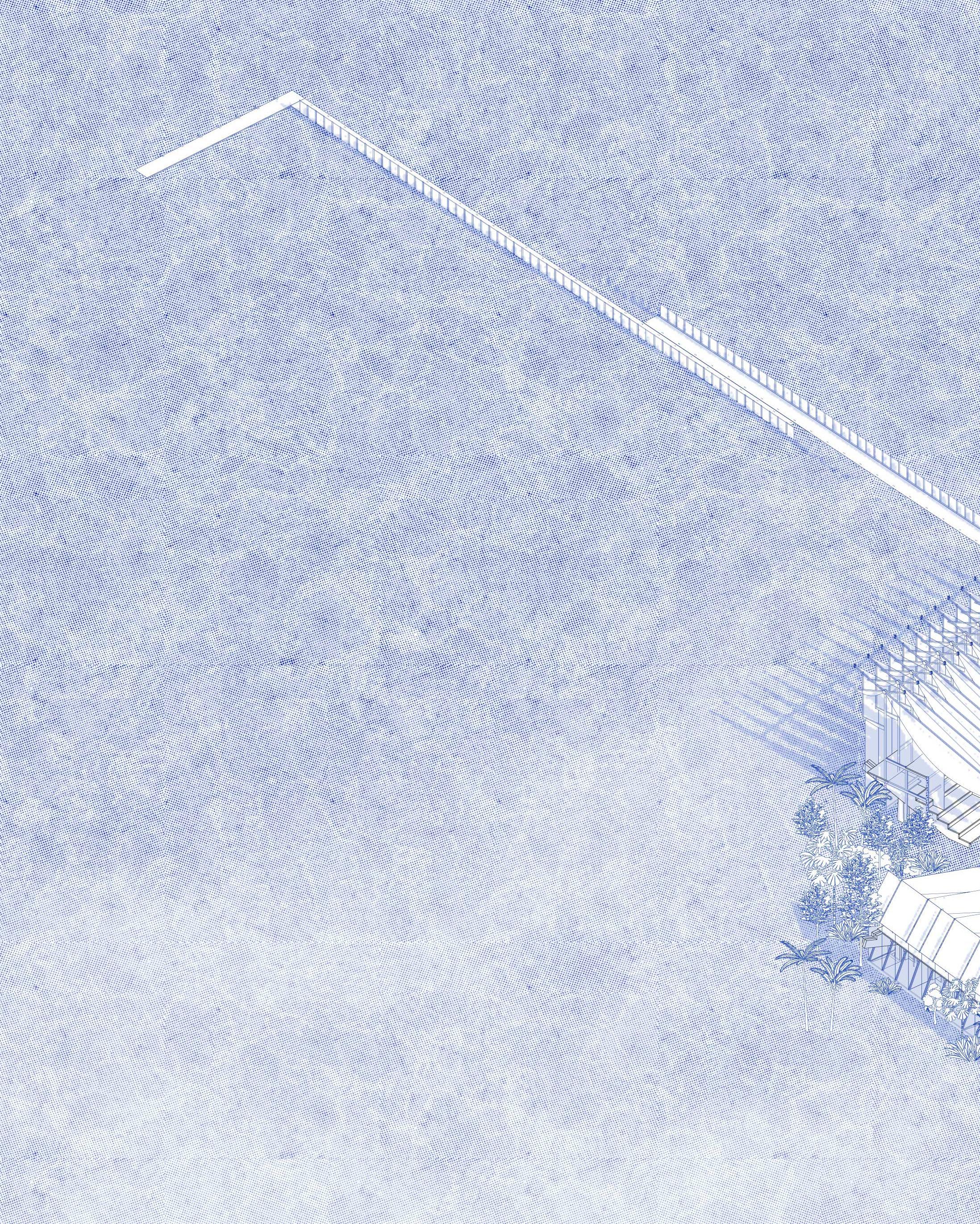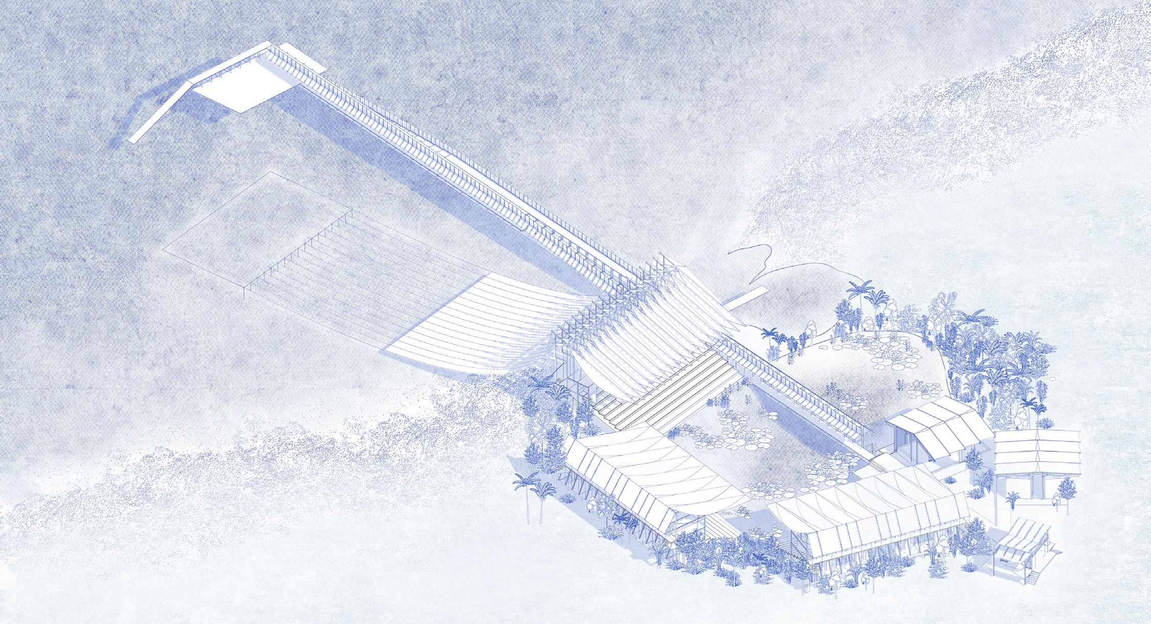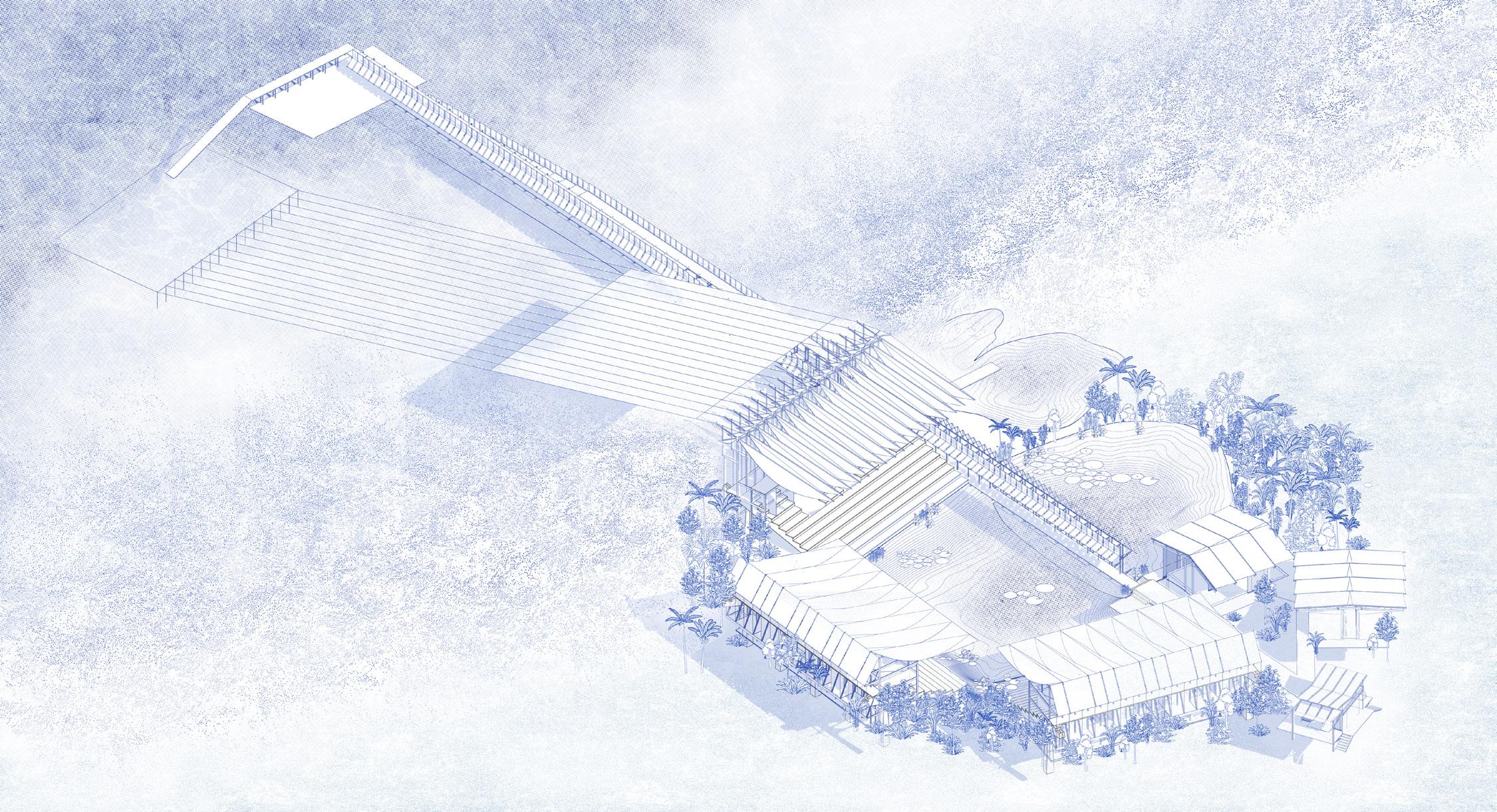 We propose an inversion of that historical hierarchy . The new architecture relinquishes its podium, descending to meet the water at its own level. It becomes a porous framework:a series of passages, platforms, and thresholds designed for subtle mediation. The rigid stage is dissolved into a wandering path that traces the land’s forgotten gradient to the mangrove.