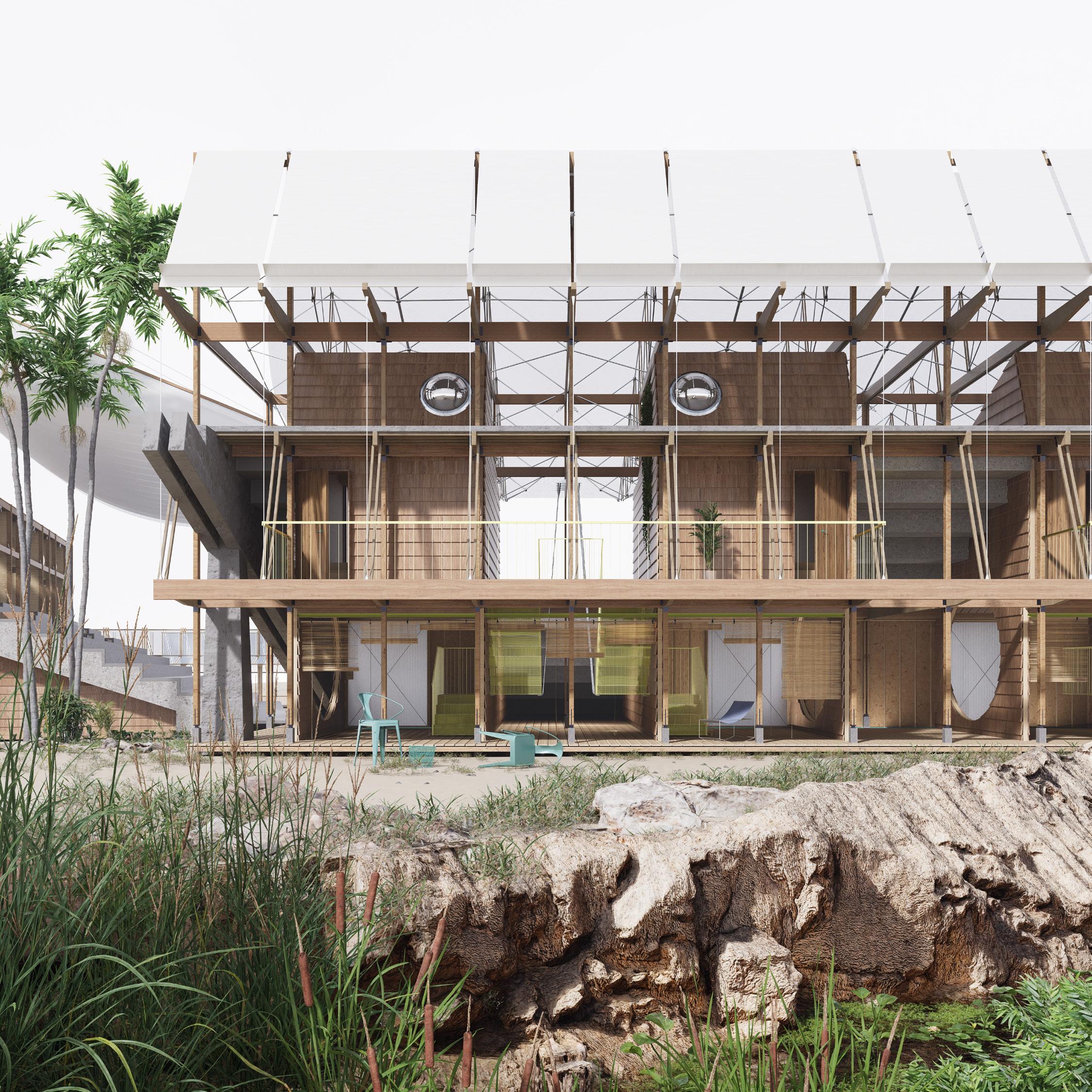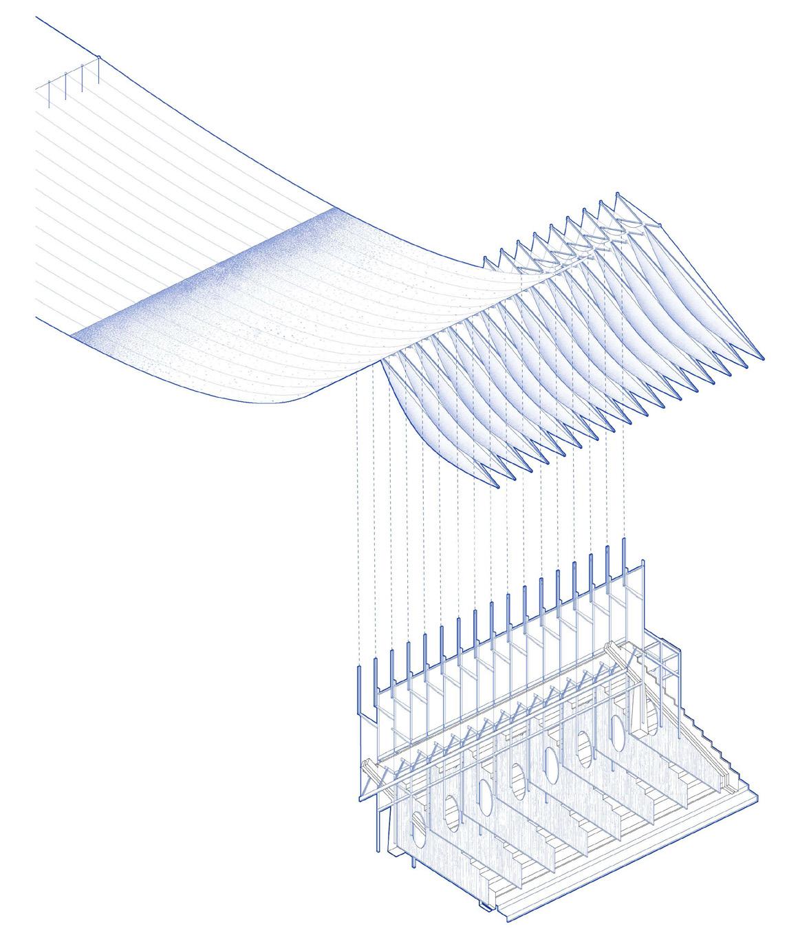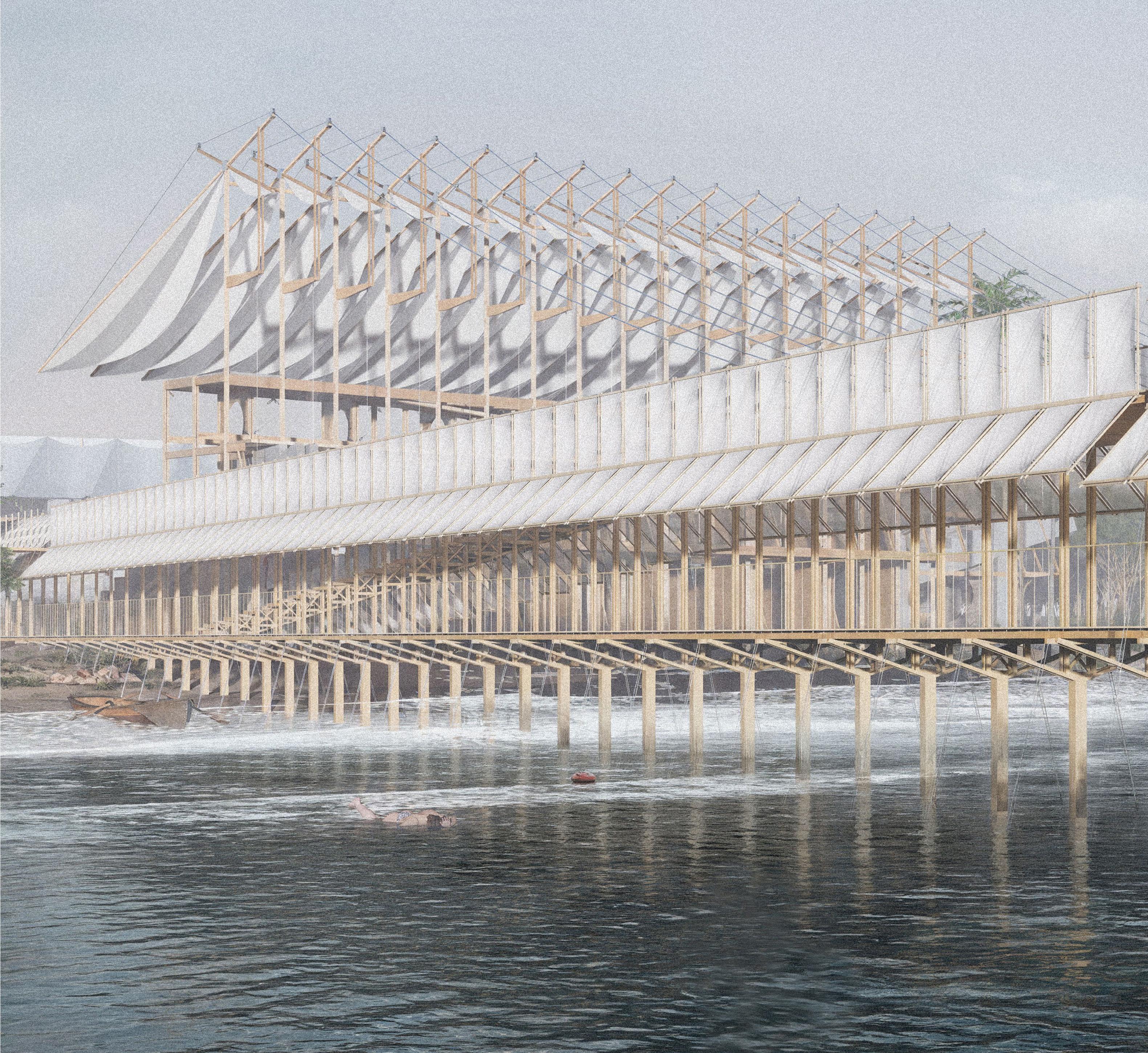 We propose an inversion of that historical hierarchy . The new architecture relinquishes its podium, descending to meet the water at its own level. It becomes a porous framework:a series of passages, platforms, and thresholds designed for subtle mediation. The rigid stage is dissolved into a wandering path that traces the land’s forgotten gradient to the mangrove.
